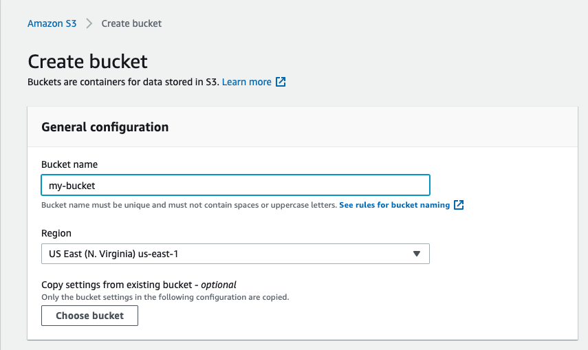 Create a unique bucket name. All other settings are optional.