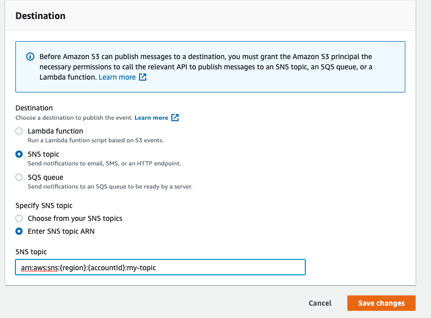 Under Destination > Destination, select SNS topic. Under Specify SNS topic, select Choose from your SNS topics. Find your SNS topic created in the previous section.