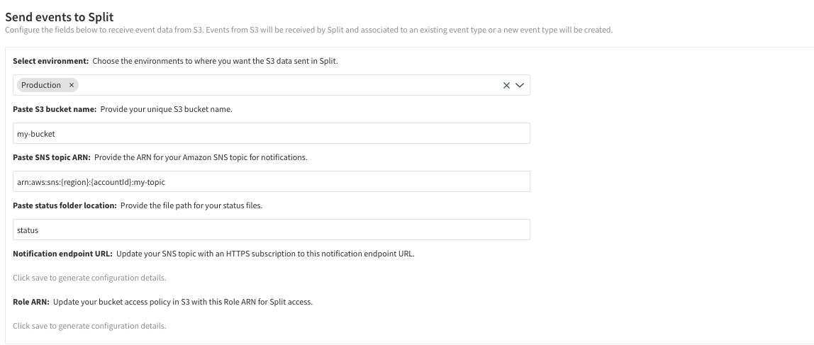 Navigate back to your Amazon S3 integration. Harness FME has generated the Notification endpoint URL and Role ARN fields.