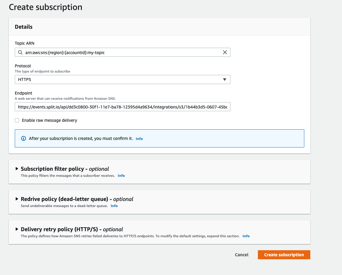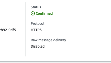 Click Create subscription. On the confirmation page, confirm that Check status is "confirmed” and Protocol is “https."