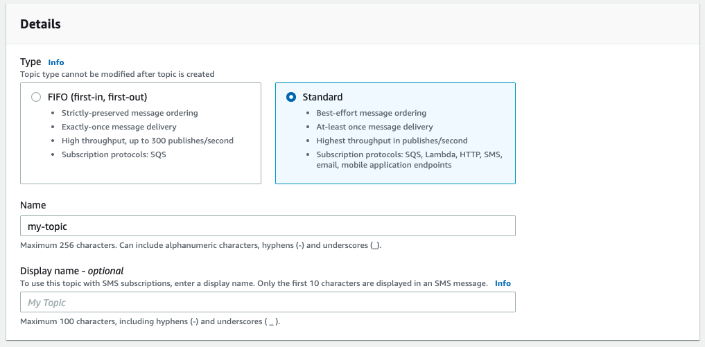 Create a Name for your SNS topic, e.g. "fme-events".