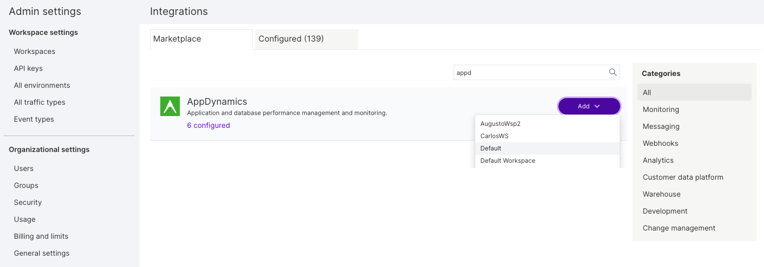 1. From the left navigation, click the profile button at the bottom, select Admin settings, click Integrations, and navigate to the Marketplace.