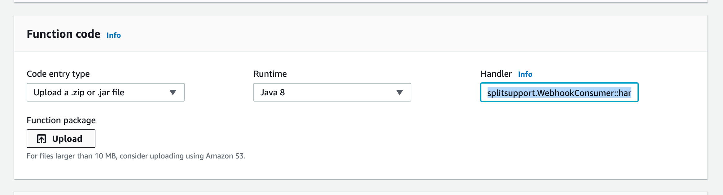 Back on the AWS Lambda page, under the Function code section, update the Handler box with the following: