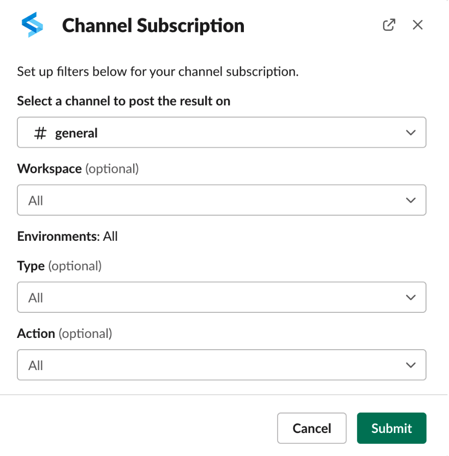 command to create a channel subscription, which subscribes your Slack channel to Harness FME notifications. The Channel menu list is pre-selected with the current channel. However, a user can select a different channel if desired. Optionally select your desired filter criteria and click Submit to create the channel subscription.