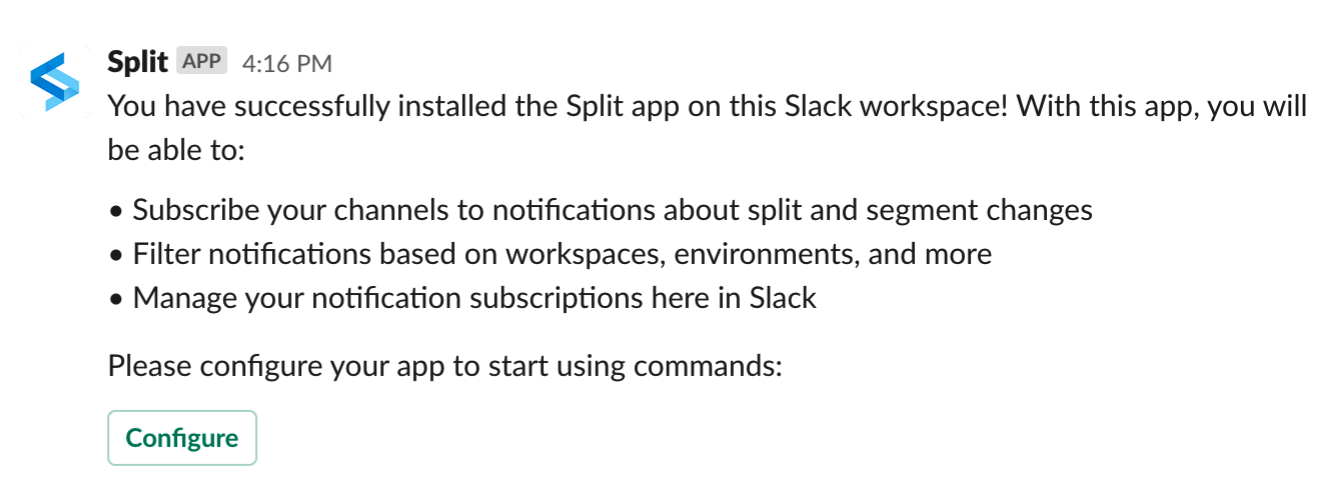 command to display the Configure Split app modal. When you enter your Harness authentication token and submit it here, this links the Slack app with your Harness account. Note that you only need to use this command if you didn’t previously click the Configure button in the welcome message.