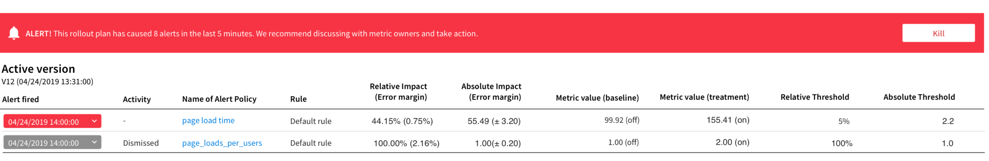 You can monitor metrics during a rollout by using automatic significance alerts. Significance alerts are automatic alerts that fire when a feature flag causes a statistically significant change in a metric linked to the flag. These alerts are supported for guardrail metric alerts (global) and key metric alerts (flag-specific) in production environments only.