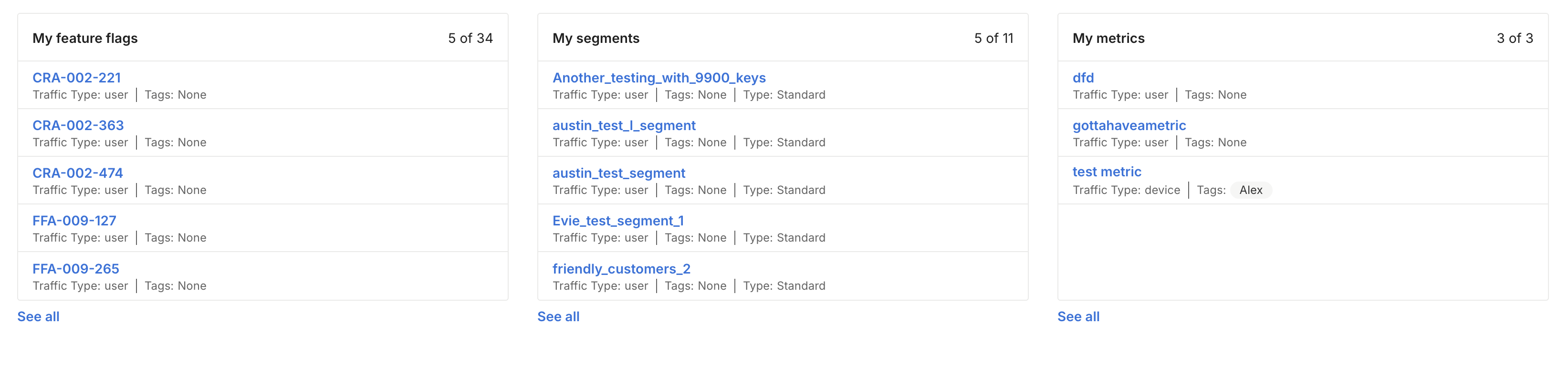 If you own any feature flags, segments, or metrics, they appear on this section for quick navigation links to see the objects you own.