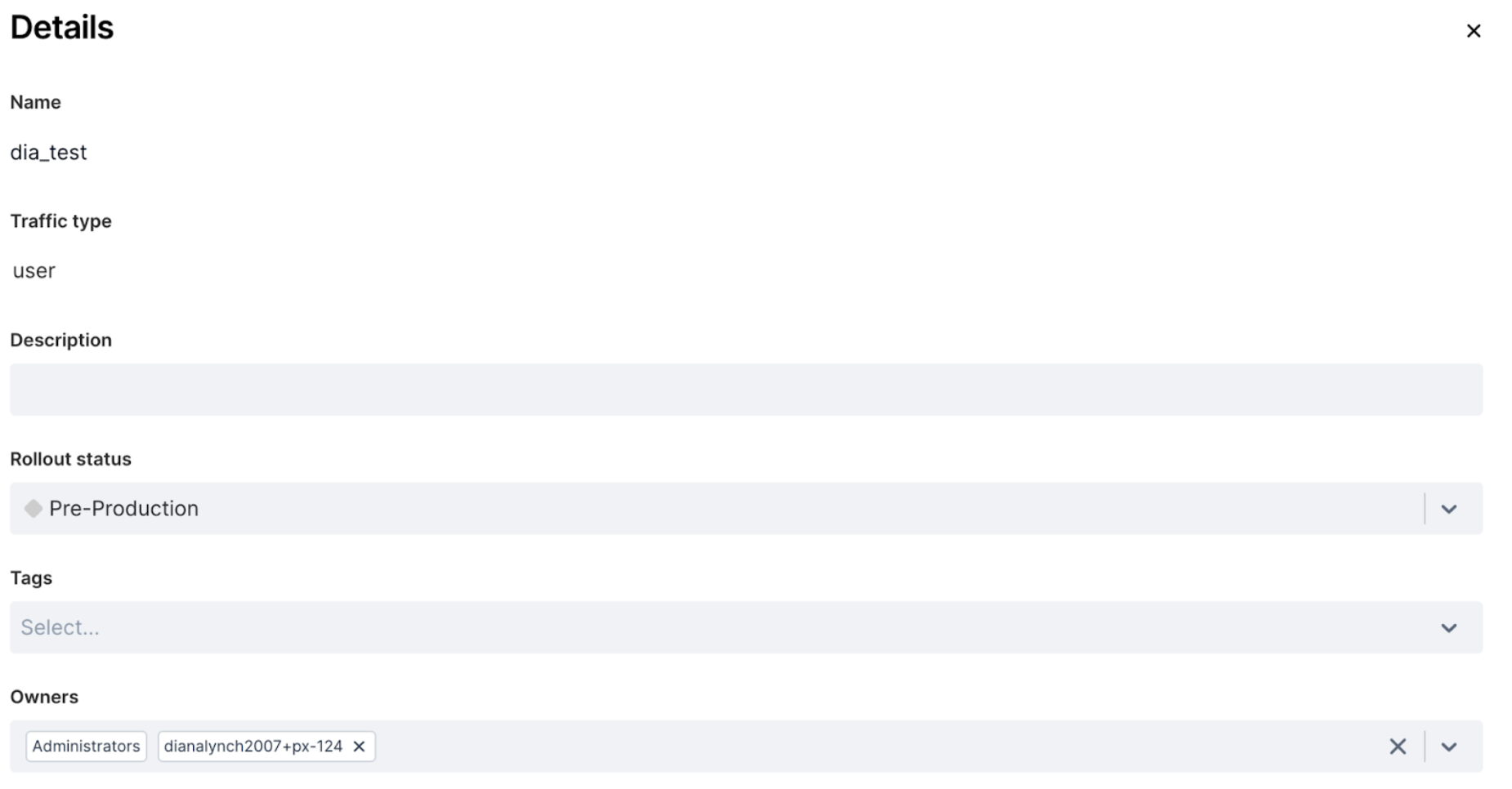 Click the Gear icon next to the feature flag name and select Edit details. The Details panel appears.