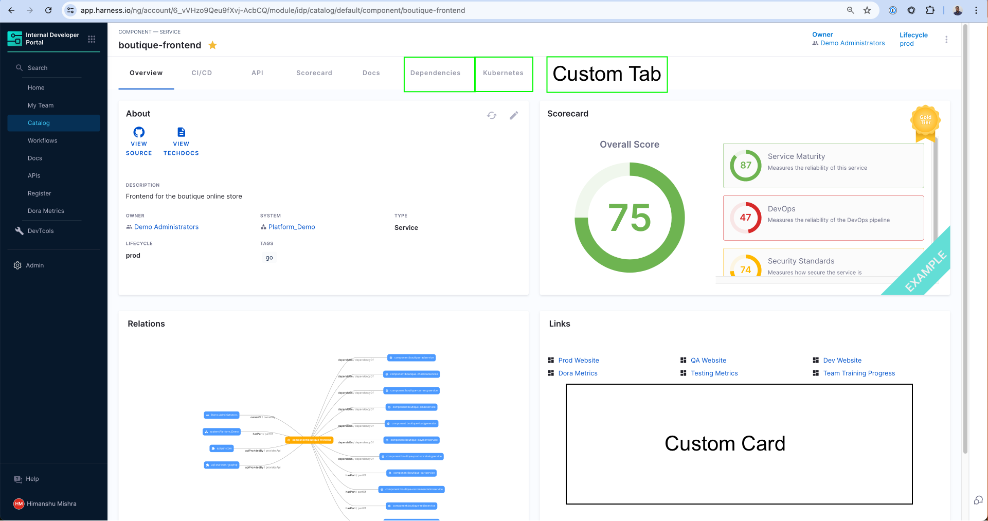 • All views inside a tab are powered by out-of-the-box components like the "About Card," "Scorecard Card," and the Plugins configured for your instance.