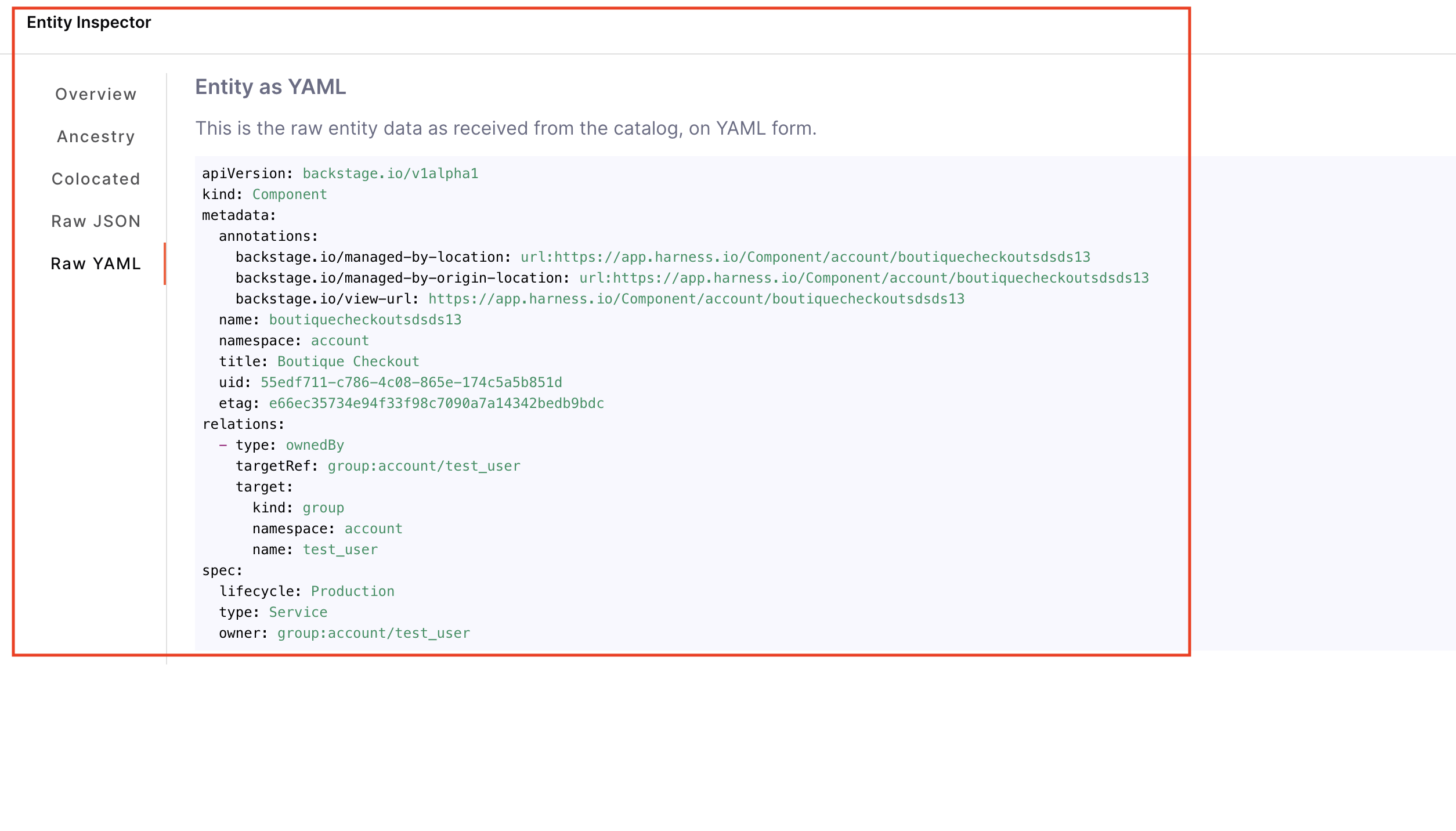This opens the Entity Inspector, where you can review both the Raw YAML and Raw JSON representations.