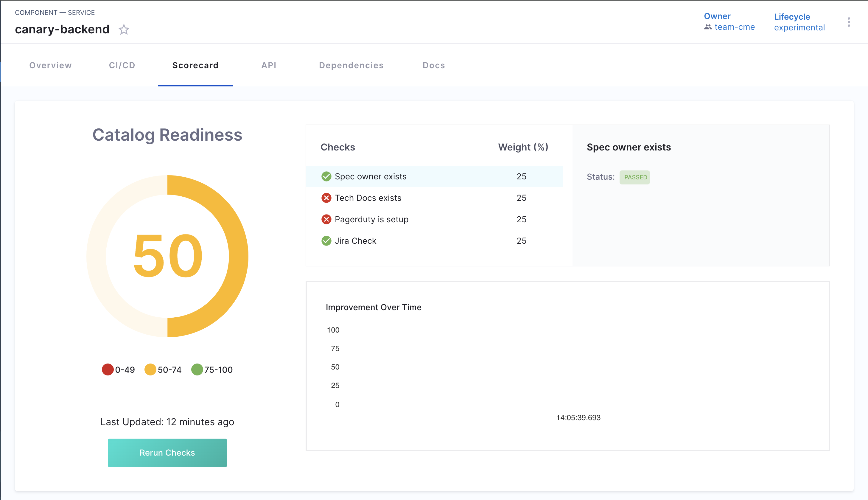 The Catalog Readiness Scorecard evaluates the completeness and quality of metadata for software components within the catalog. It helps teams ensure that their components adhere to best practices, meet organizational standards, and provide the necessary information for discoverability, integration, and automation.