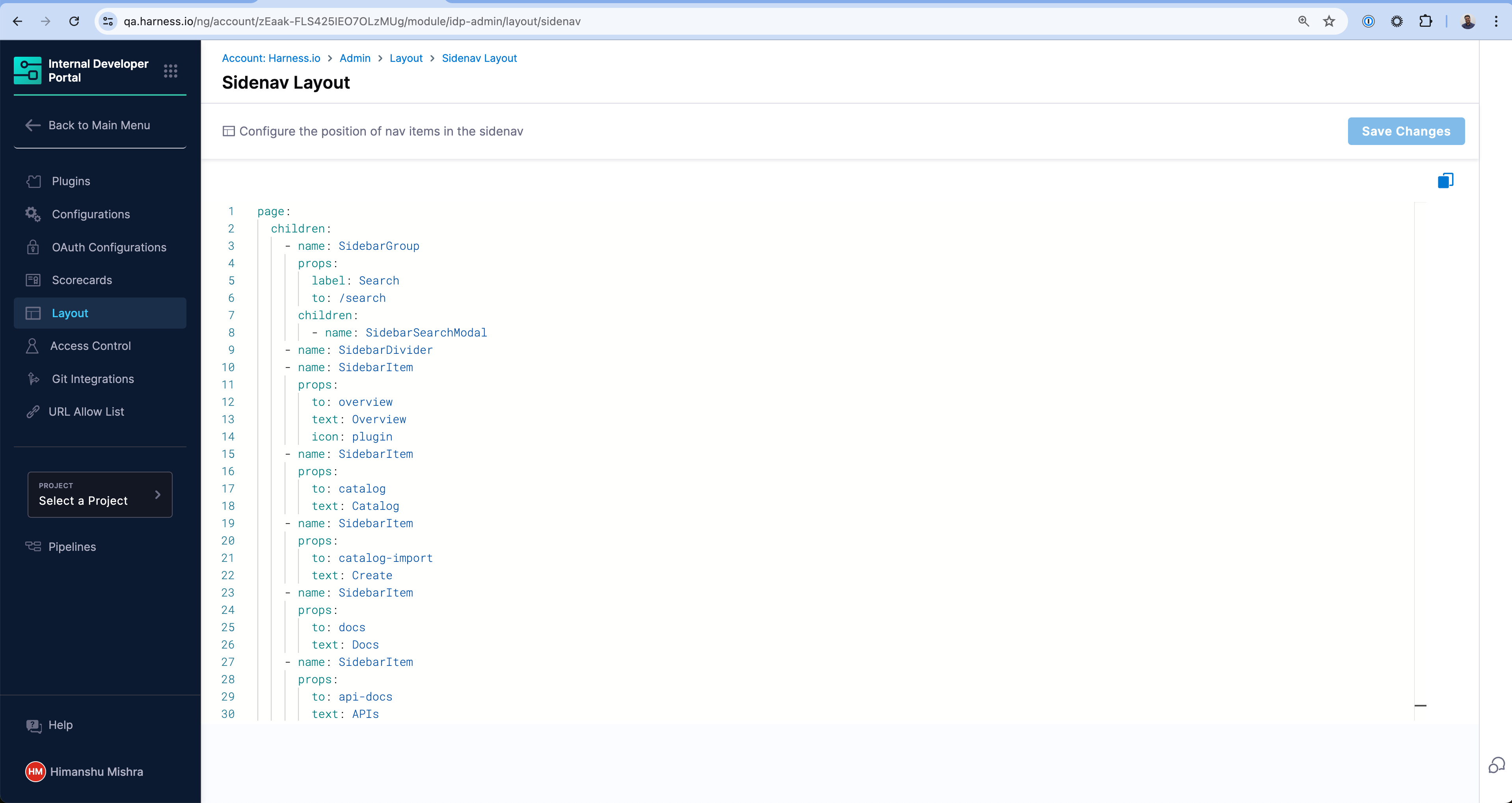 You can access the Sidenav Layout editor by navigating to Harness IDP and choosing Admin from the sidebar.