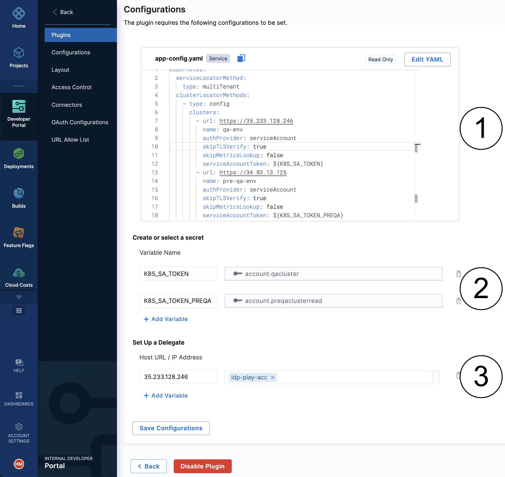in the application configuration YAML file must have a corresponding secret value defined. The secrets configured in IDP are stored in the Harness platform's built-in secret manager or your own secret manager. In case you are using your own secret manager, you will need to configure a Delegate proxy like the one below and ensure the delegate has access to your secret manager.