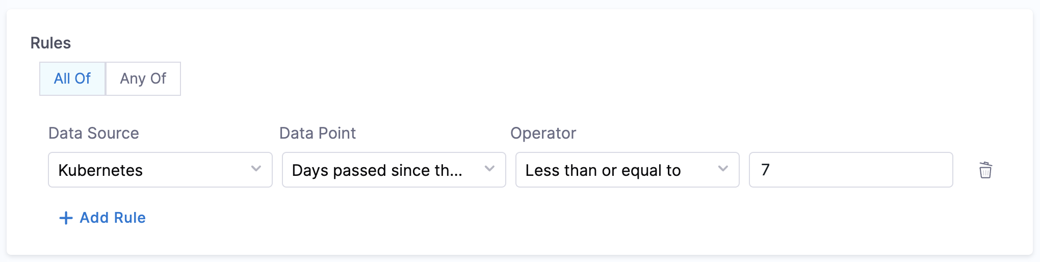 is used from the conditions section. The cluster details configured in the Kubernetes plugin are used. If more than one cluster is configured, the workload search is done in each cluster and the oldest deployment time of all is taken into consideration. - Prerequisites: The Kubernetes plugin needs to be configured and enabled in the admin section. Refer here for more details.
