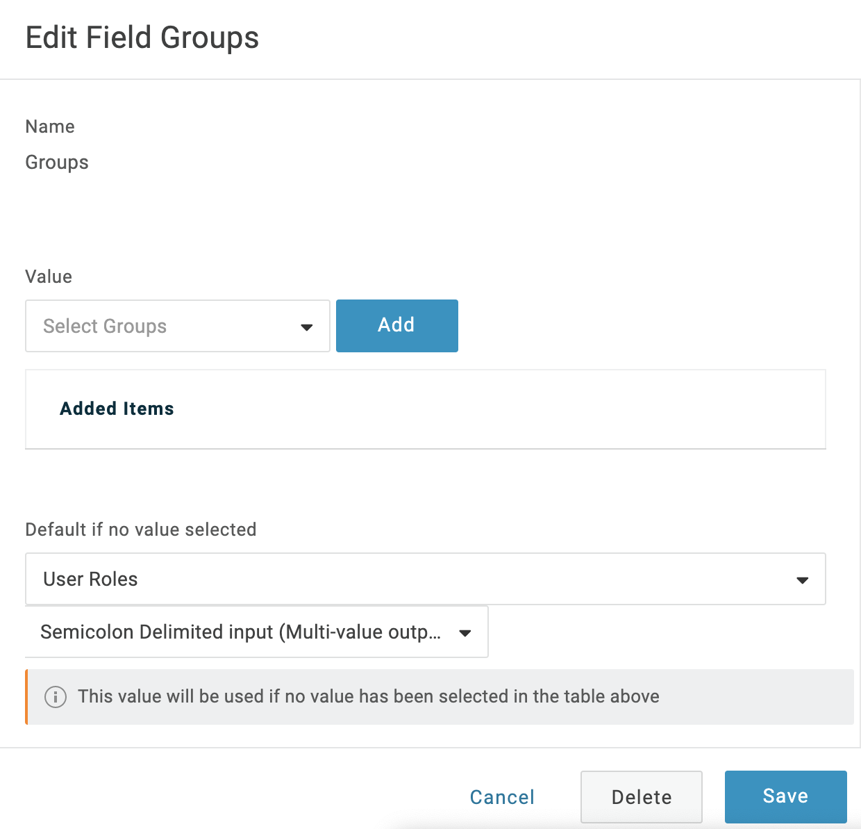In the resulting Edit Field Groups dialog, set Default if no value selected to User Roles. Below that, select Semicolon Delimited input (Multi-value output). Then select Save.