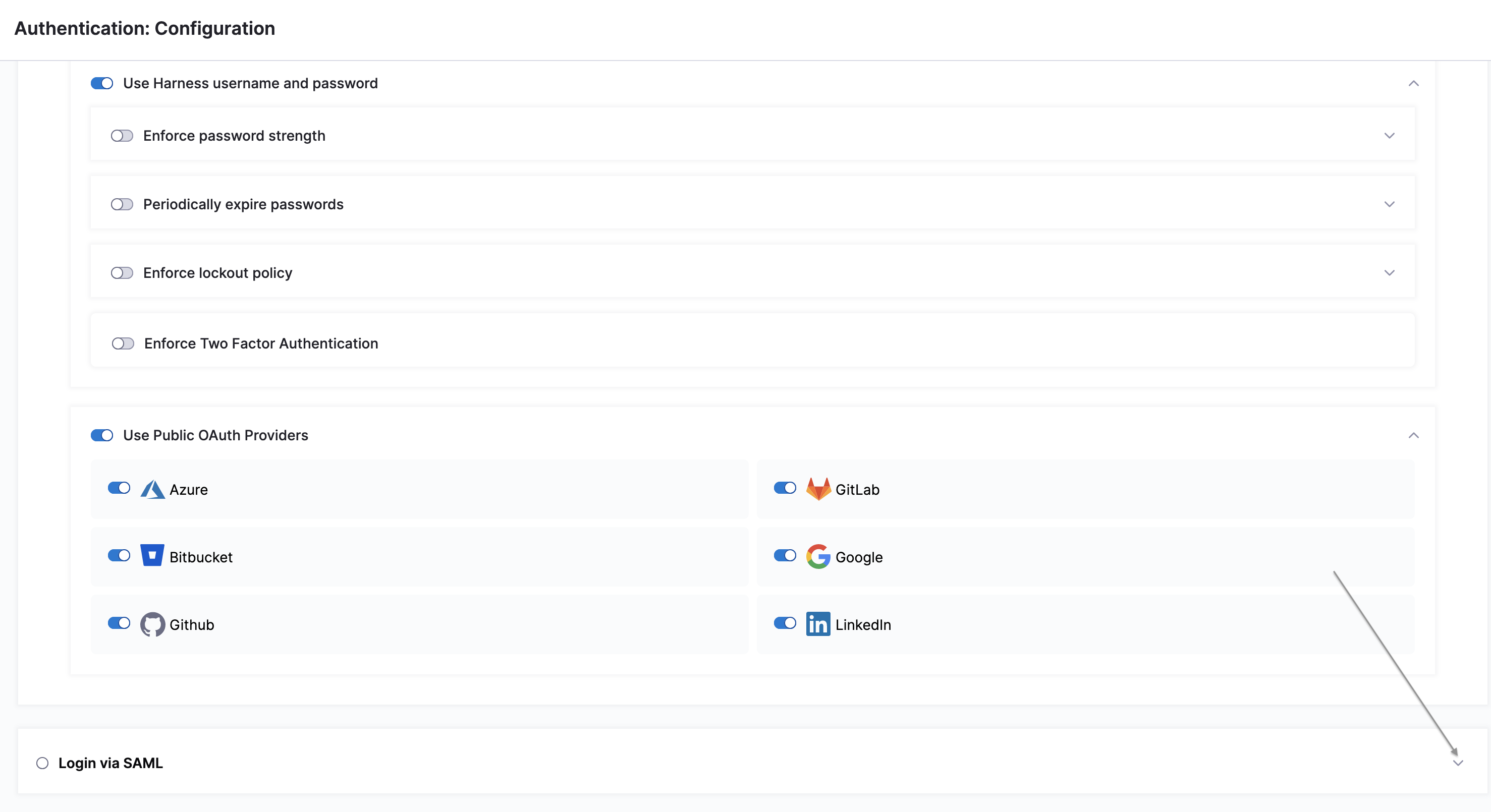 Select Add. The new SSO provider is displayed under Login via SAML. You might need to expand this section using the arrow on the right-hand side of the screen.
