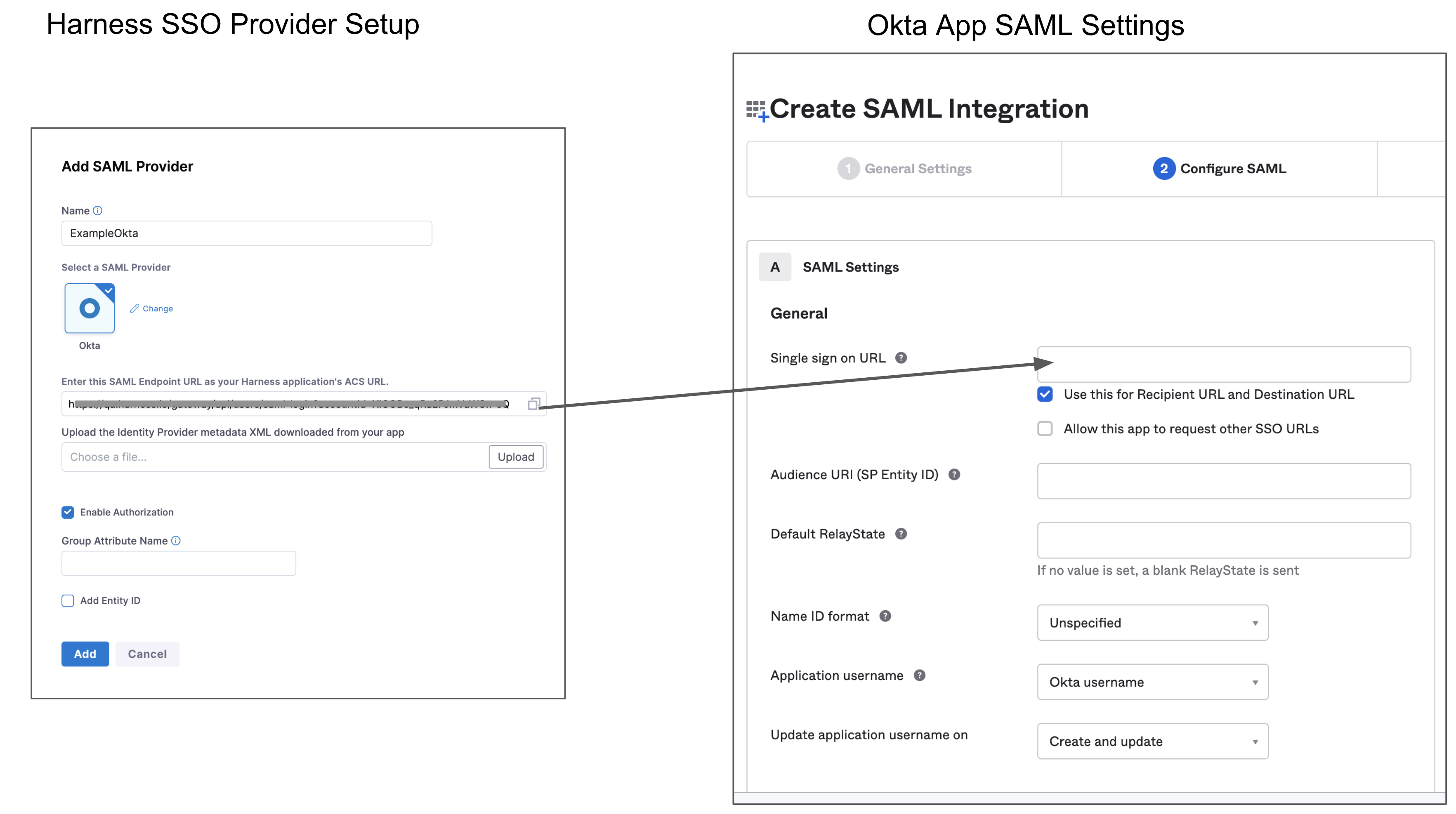 Copy the endpoint URL from Enter this SAML Endpoint URL as your Harness application's ACS URL. This is the URL you need to paste in the Single sign on URL field in Okta.