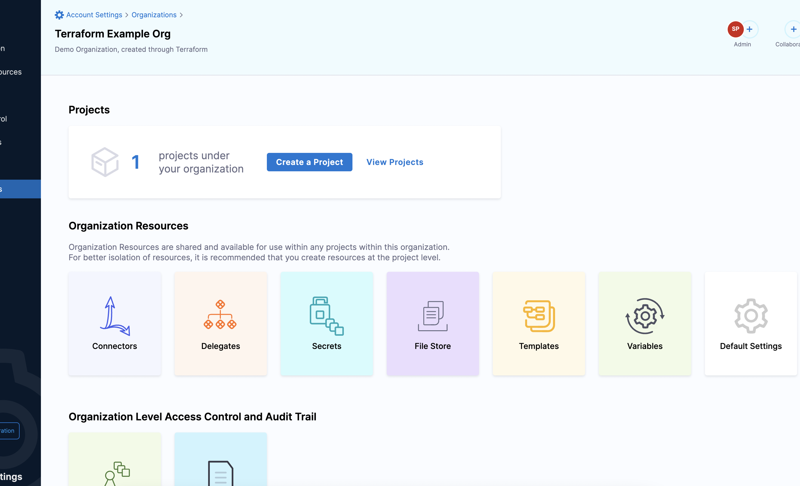 Harness Terraform Provider lets you use Terraform scripts to configure Harness. Through scripts, it supports the creation of all the key Harness objects, including Projects, Pipelines, Connectors, and Secrets.