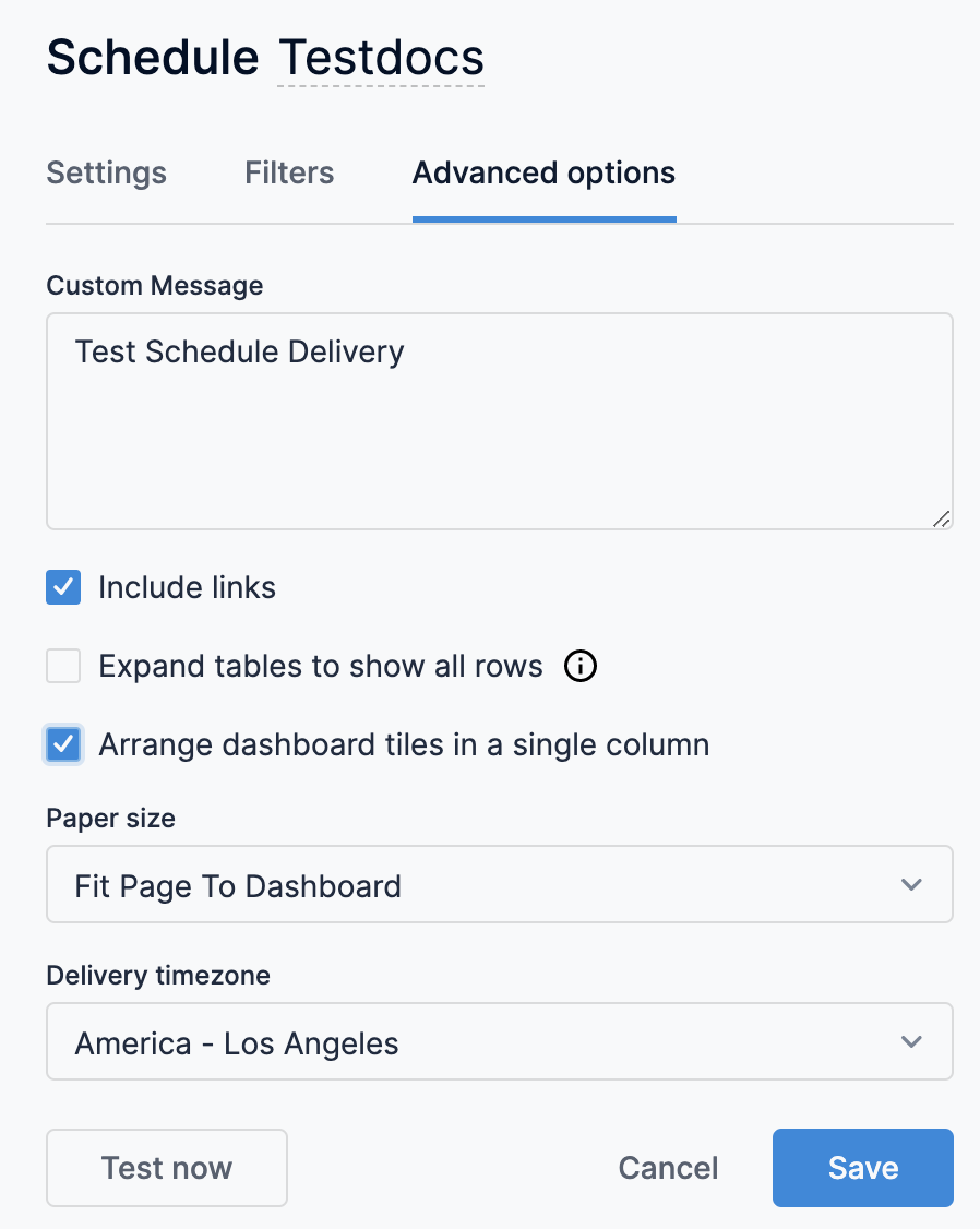 - PDF: An image of the dashboard as a single PDF file. The default layout displays tiles as they are arranged in the dashboard, but other layout and sizing options are available under Advanced options. For deliveries to email, the file is delivered as an email attachment.