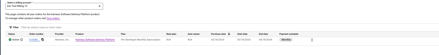 Navigate to Marketplace and go to the Orders section. Initially, your order is in a pending state while the Harness system approves and activates your account. The activation can take several minutes.