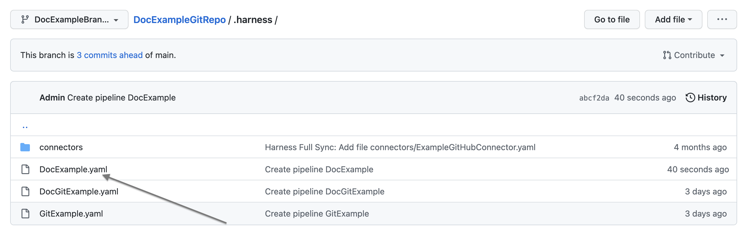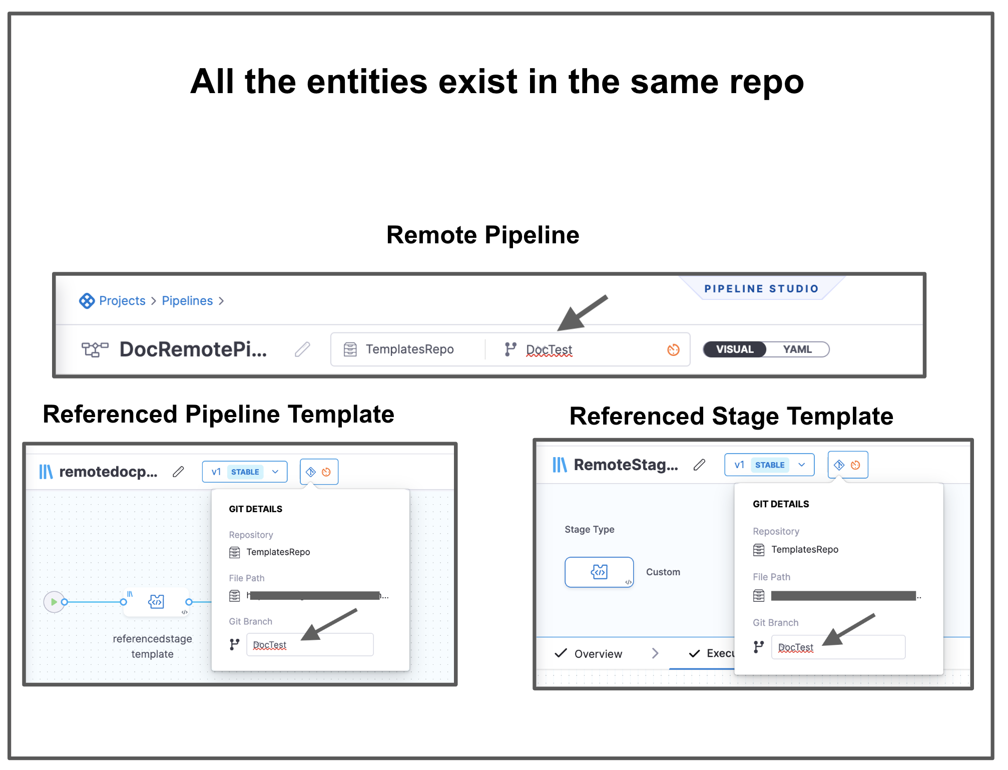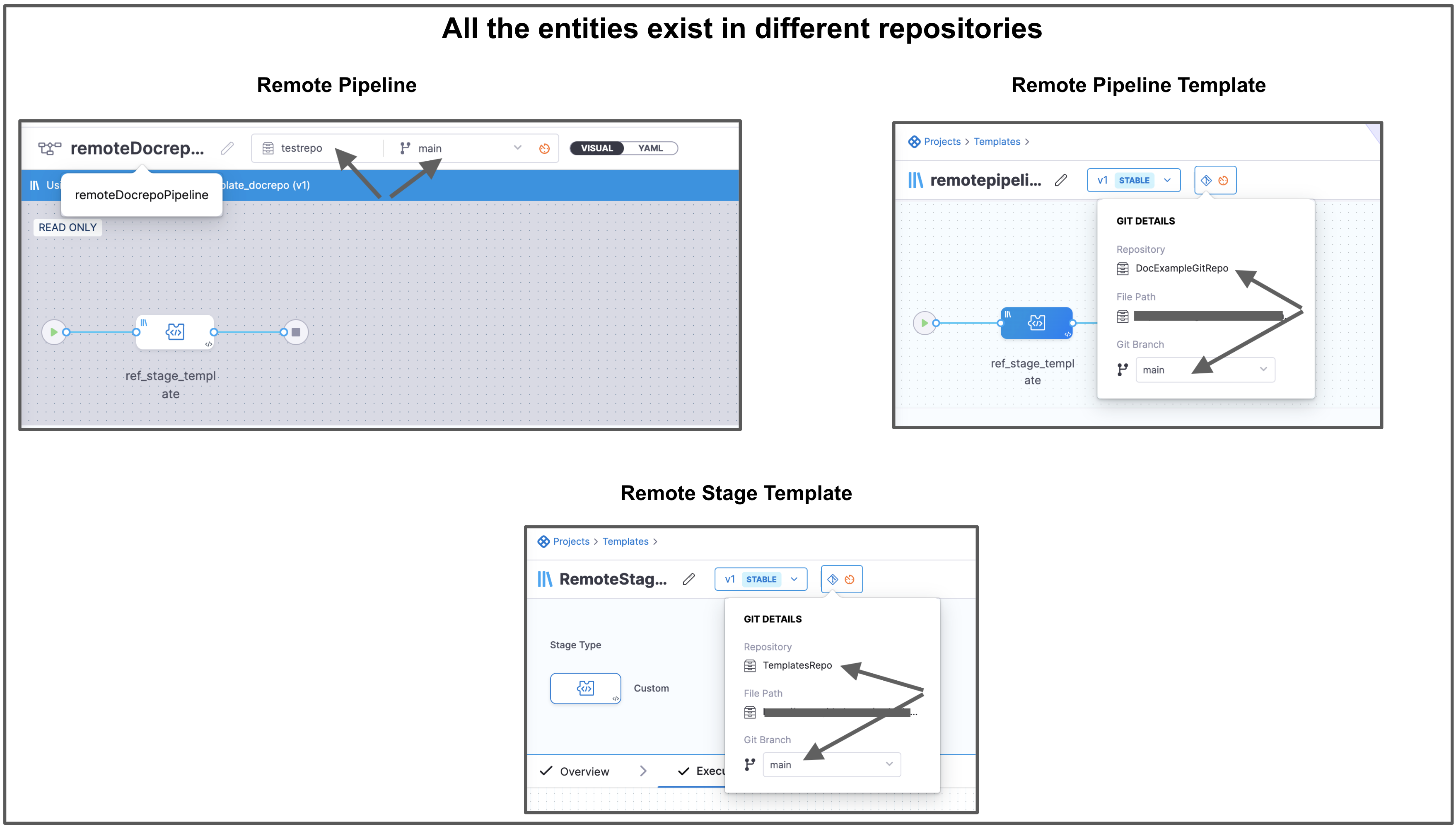 When you execute this pipeline, Harness fetches these nested entities from the default branch of the respective repositories.