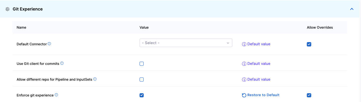 To override this setting in the child scopes, select Allow Overrides beside the settings. This forces configurations at the account scope to be saved in Git repositories only. Users can, however, still create inline pipelines and templates at the organizational and project levels.