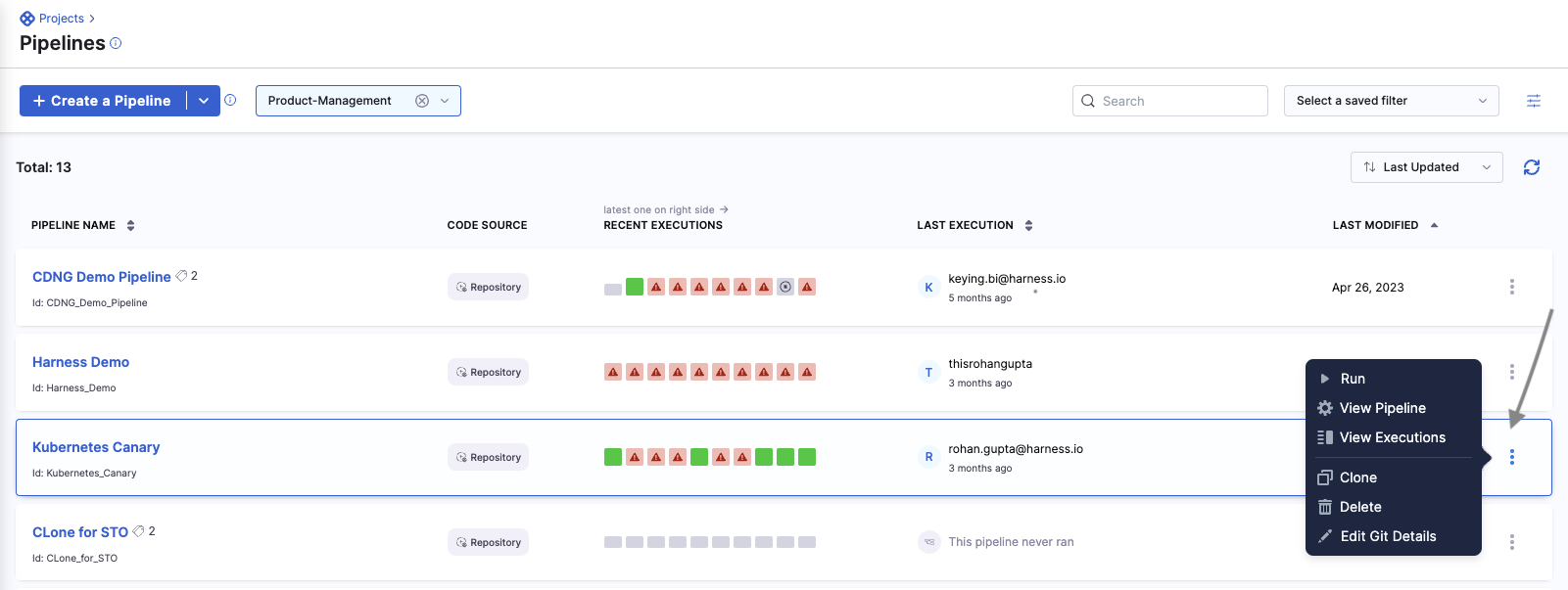 Go to the pipeline where you want to edit the Git details, and select more options (⋮).