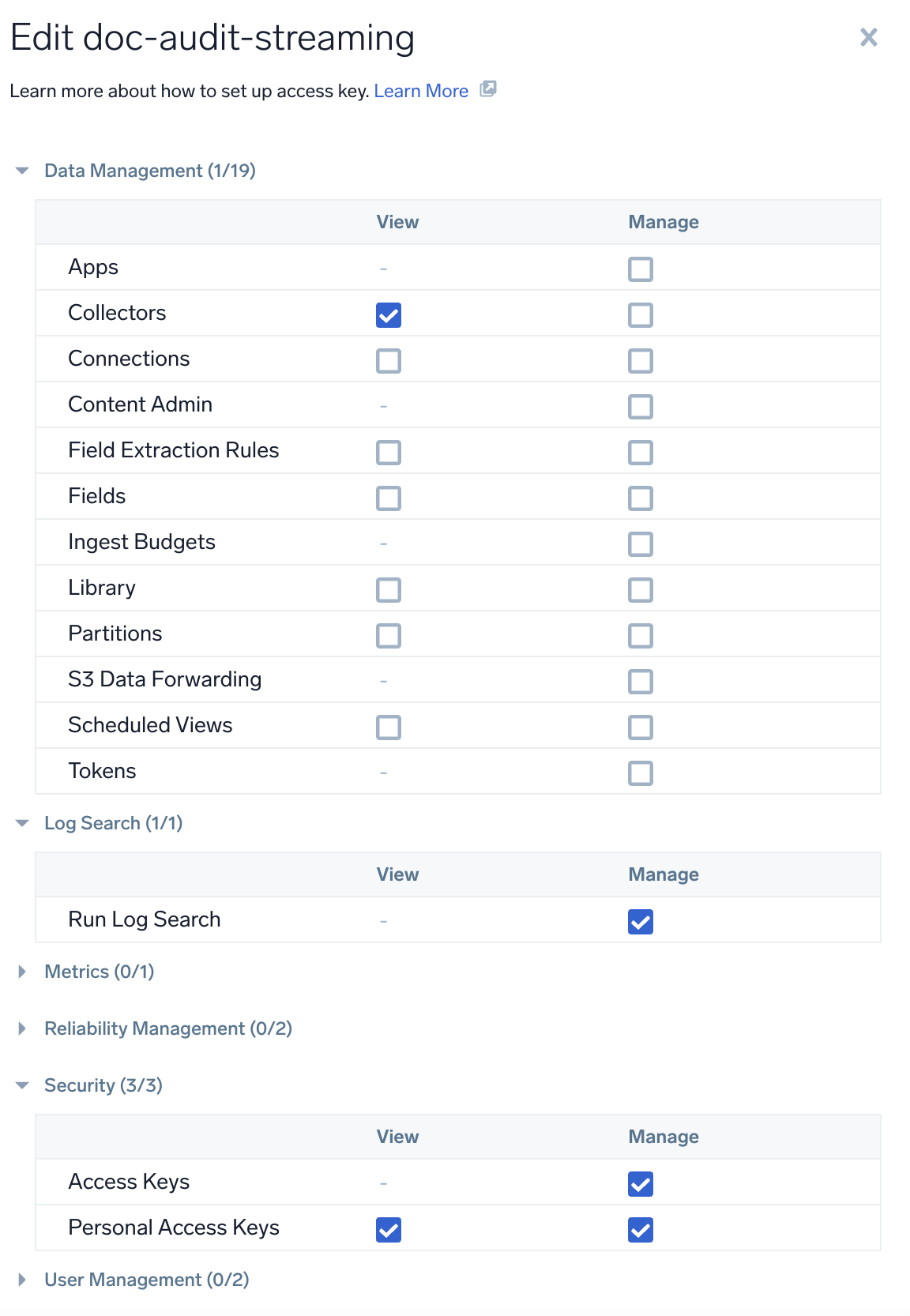 Sumo Logic's Access ID and Access Key. An Access Key can have two scope types: Default and Custom. If selecting Custom, ensure you enable the permissions shown in the image below.