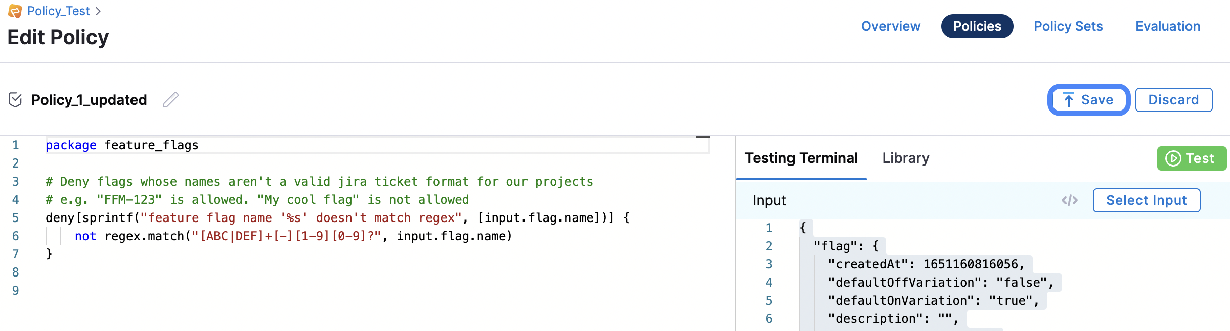 Test the updated policy in the Testing Terminal against a previous Policy Evaluation to ensure it is valid. For more information about how to do this, see Step 9 in Create a Policy.
