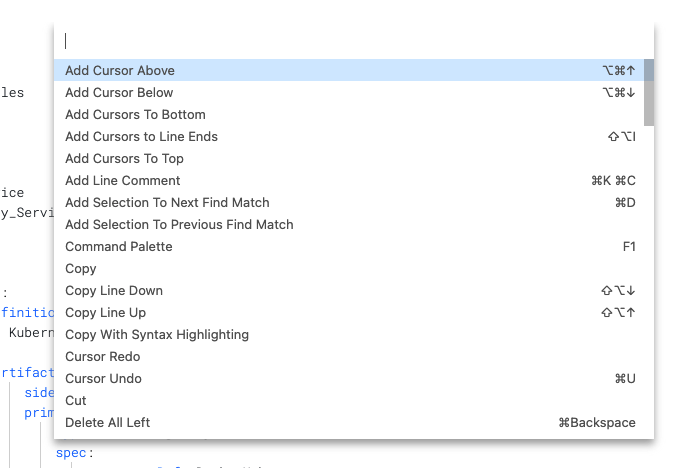 The command palette displays all of the commands and the keyboard shortcuts for most commands.
