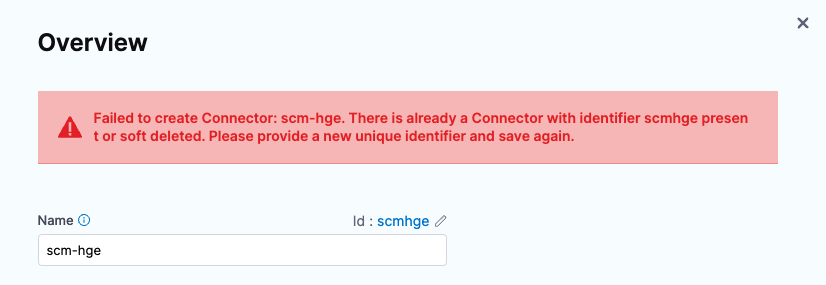 Entities and Resources in Harness have names and Ids (entity Identifier). For example, here's a GitHub Connector with the name scm-hge and the Id scmhge: