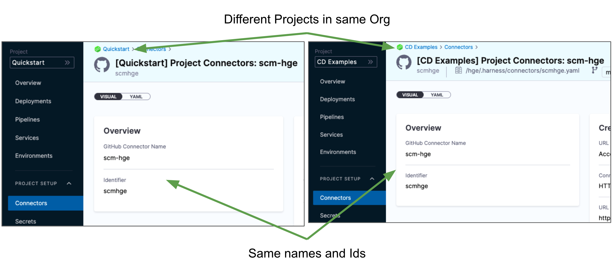 For information on Organizations and Projects, see Organizations and Projects Overview.For example, here are two GitHub Connectors with the same names and Ids but in different Harness Orgs: