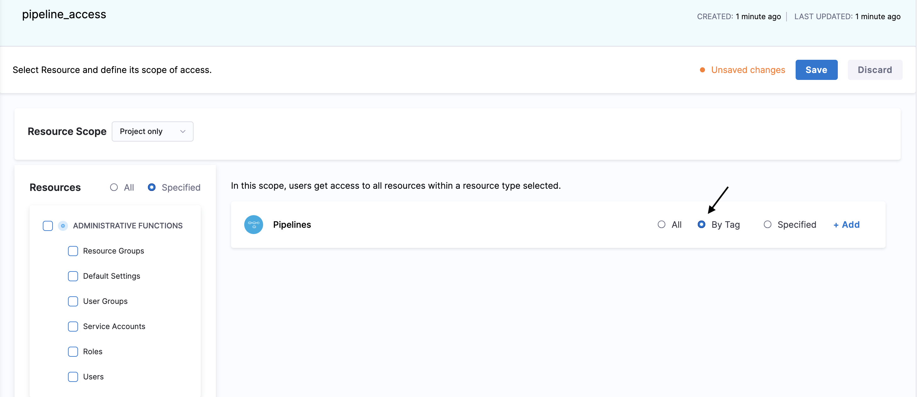 - In the Resource group, after you have selected your Resources for which you want to provide user access (i.e., Pipelines, Services, Environments, etc.), you will see three options in the Pipeline section: All, By Tag, and Specified.