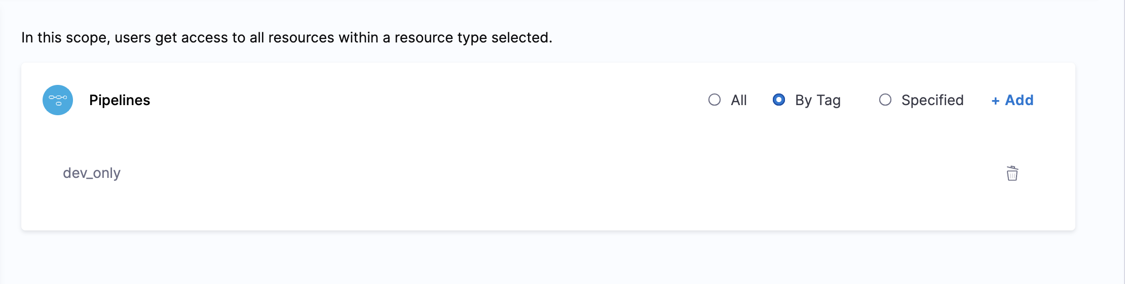 - Select By Tag and provide the tag of the pipelines you want users to have access to, in this case pipelines with tag type: dev_only.