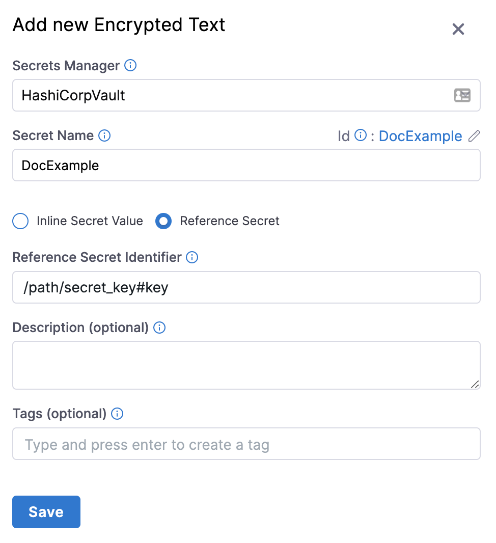 For HashiCorp Vault, you can also use expressions to reference pre-existing secrets in Vault using a fully-qualified path, such as hashicorpvault://LocalVault/foo/bar/mysecret#mykey