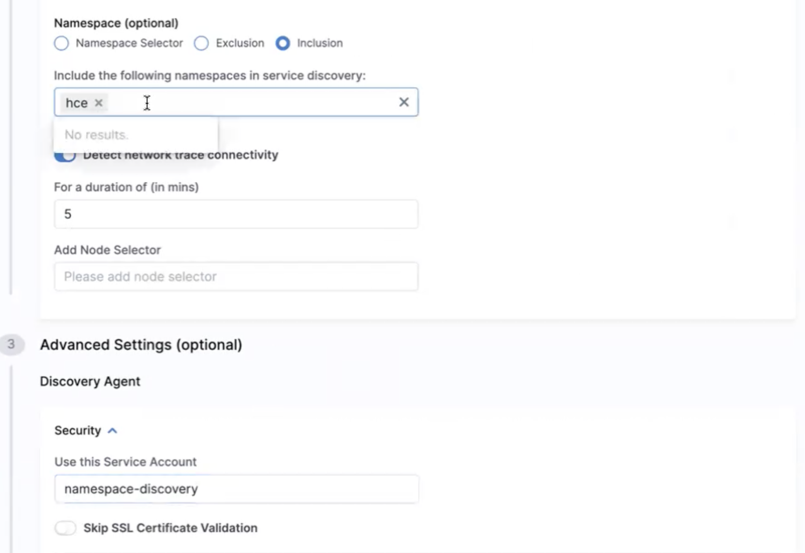 To use single namespace, select Inclusion and provide the namespace. Disable the Detect network trace connectivity.