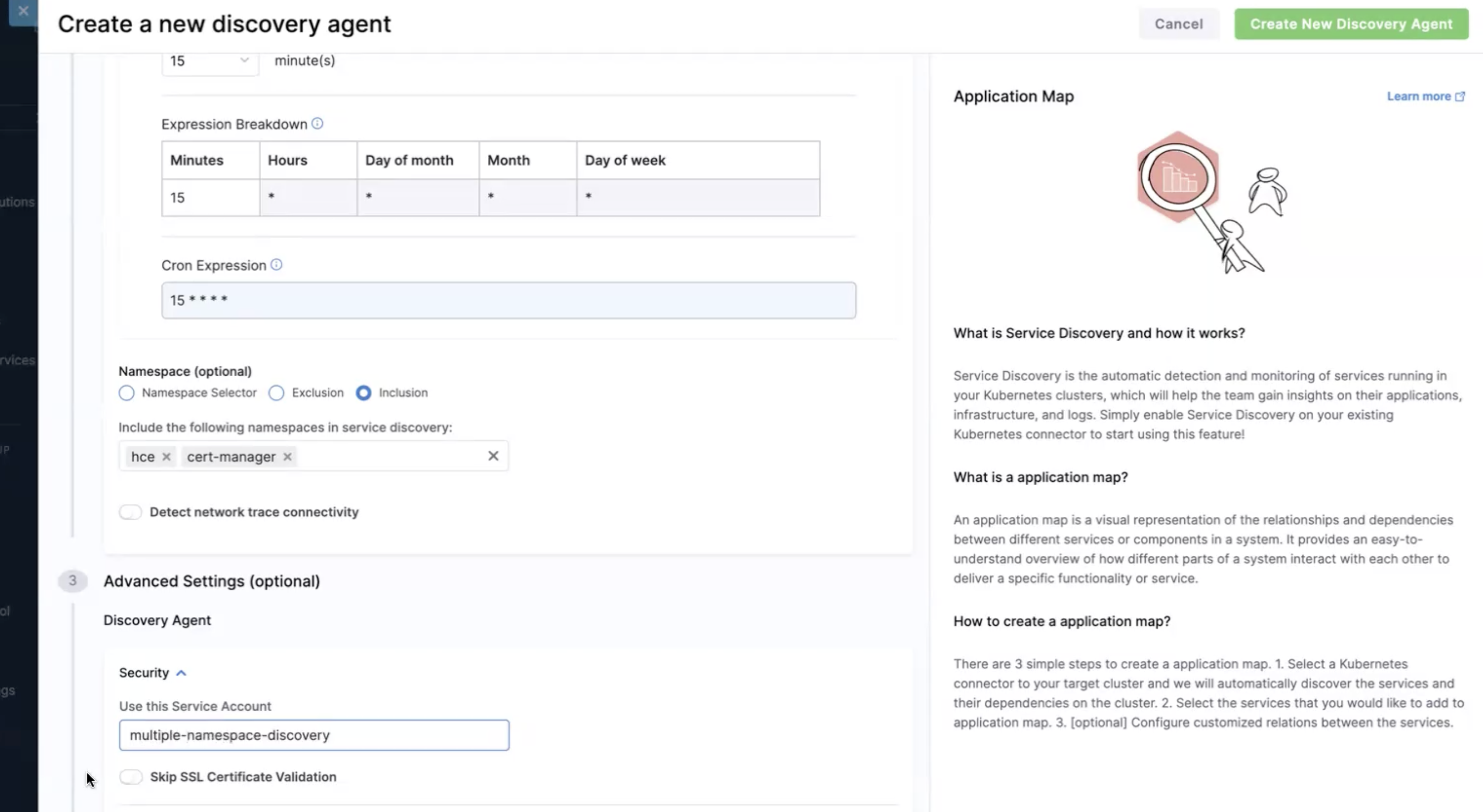 To use multiple namespaces, provide multiple namespaces and click Create New Discovery Agent.