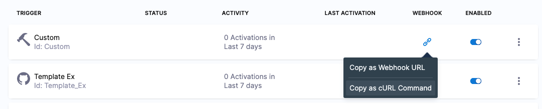 Once you create a custom trigger, Harness provides the Webhook URL and cURL command to initiate the trigger.
