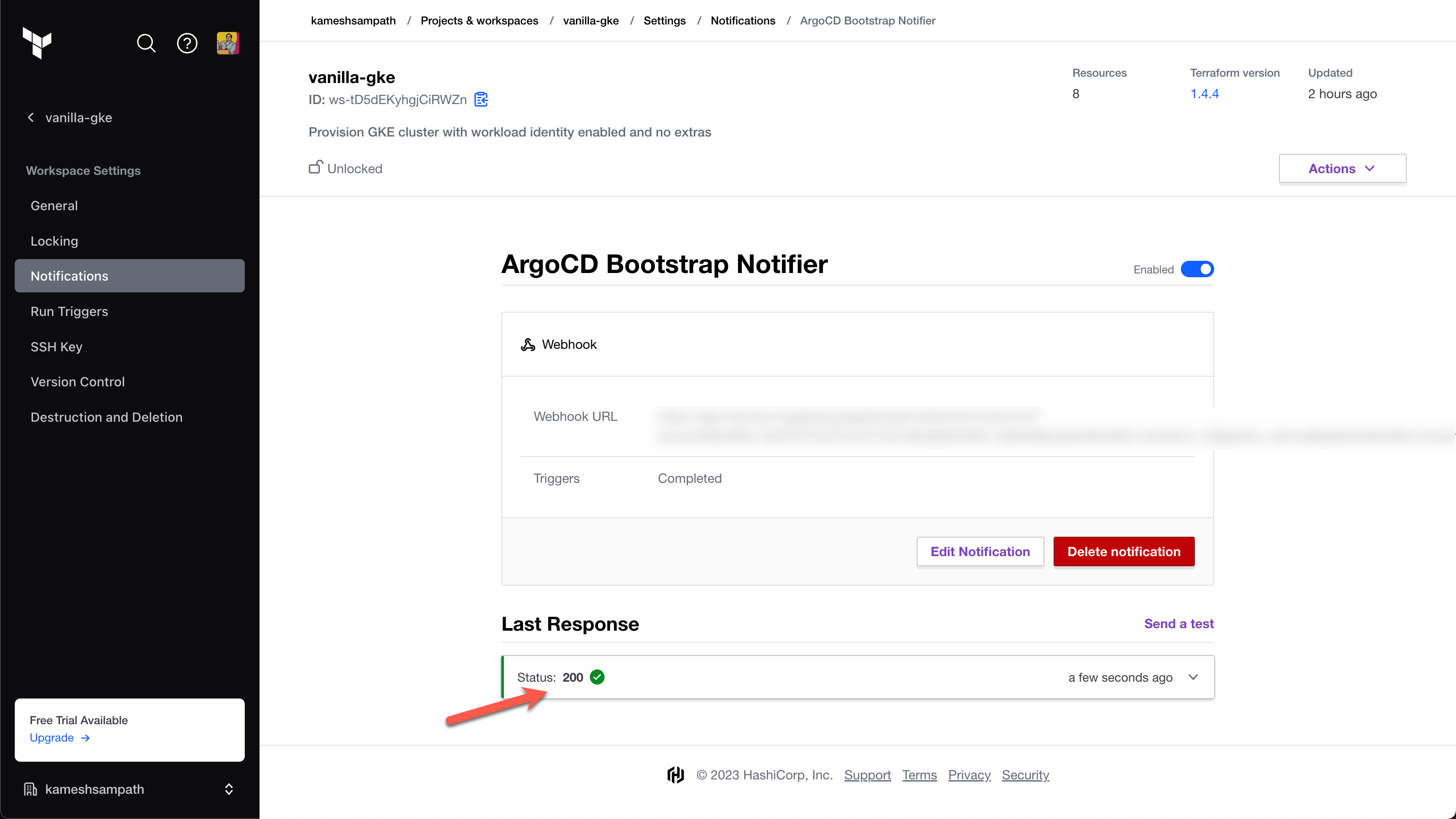 This pipeline is now configured to listen for notifications of IaC events from Terraform, and the pipeline only runs when it's necessary. Specifically in this pipeline, any changes to the $TFC_GKE_REPO