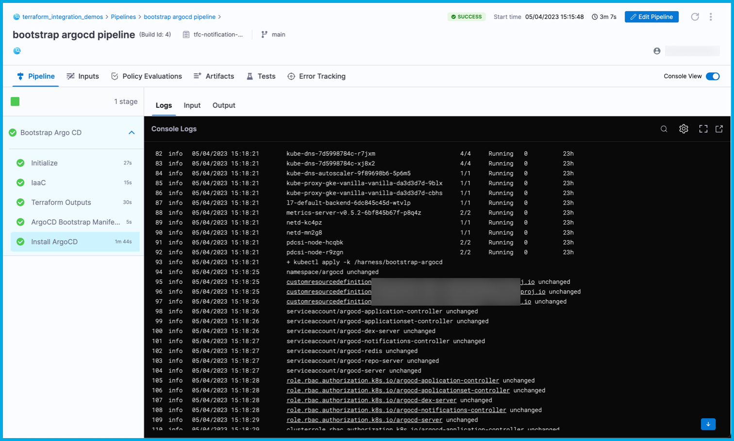 trigger a plan and apply on Terraform Cloud. A completed plan triggers the bootstrap argocd pipeline