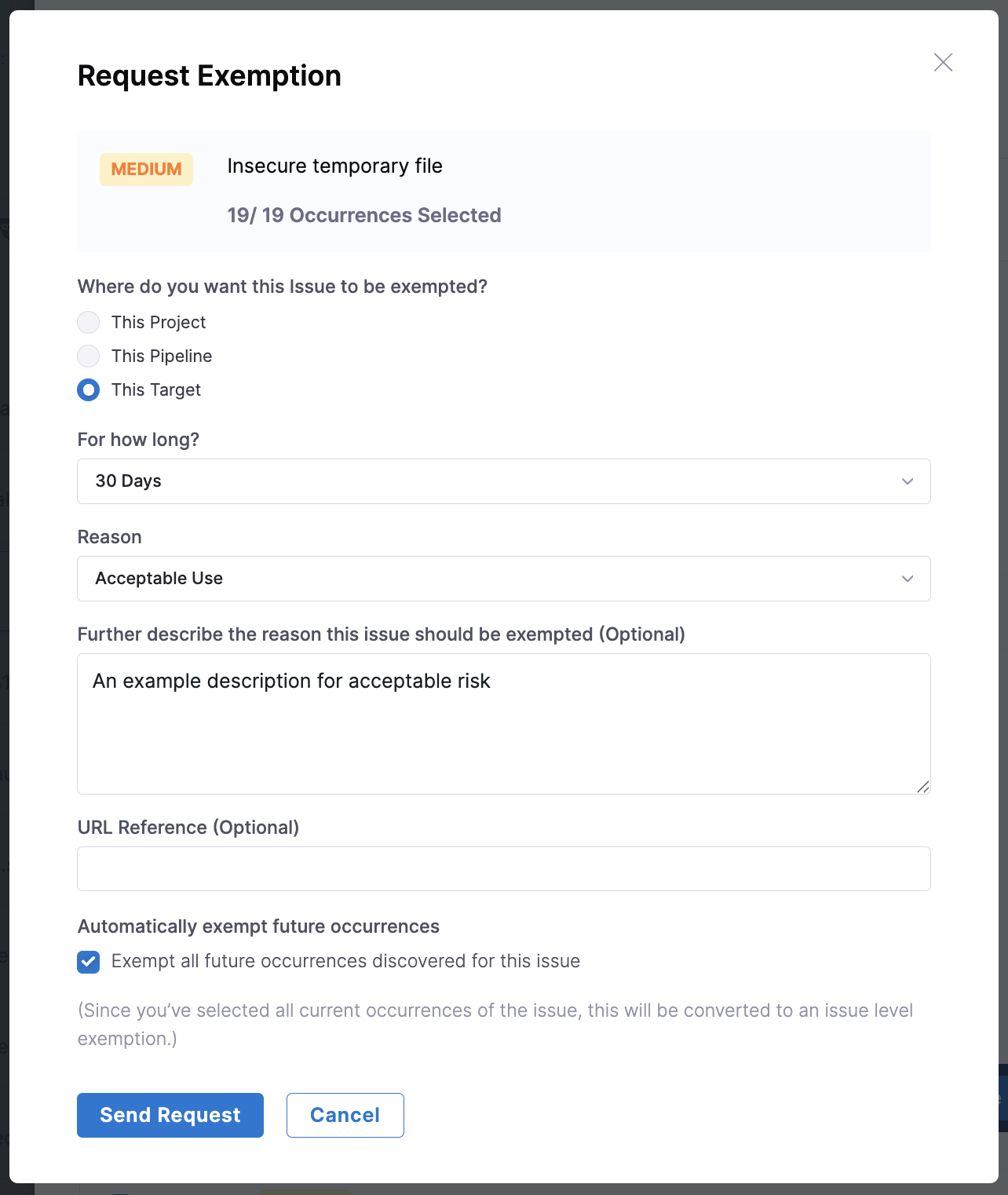 • The option Exempt all future occurrences discovered for this issue at the bottom becomes available. Checking this option converts the request from an occurrence-level exemption to an issue-level exemption. This ensures all future occurrences of the issue will automatically be exempted.