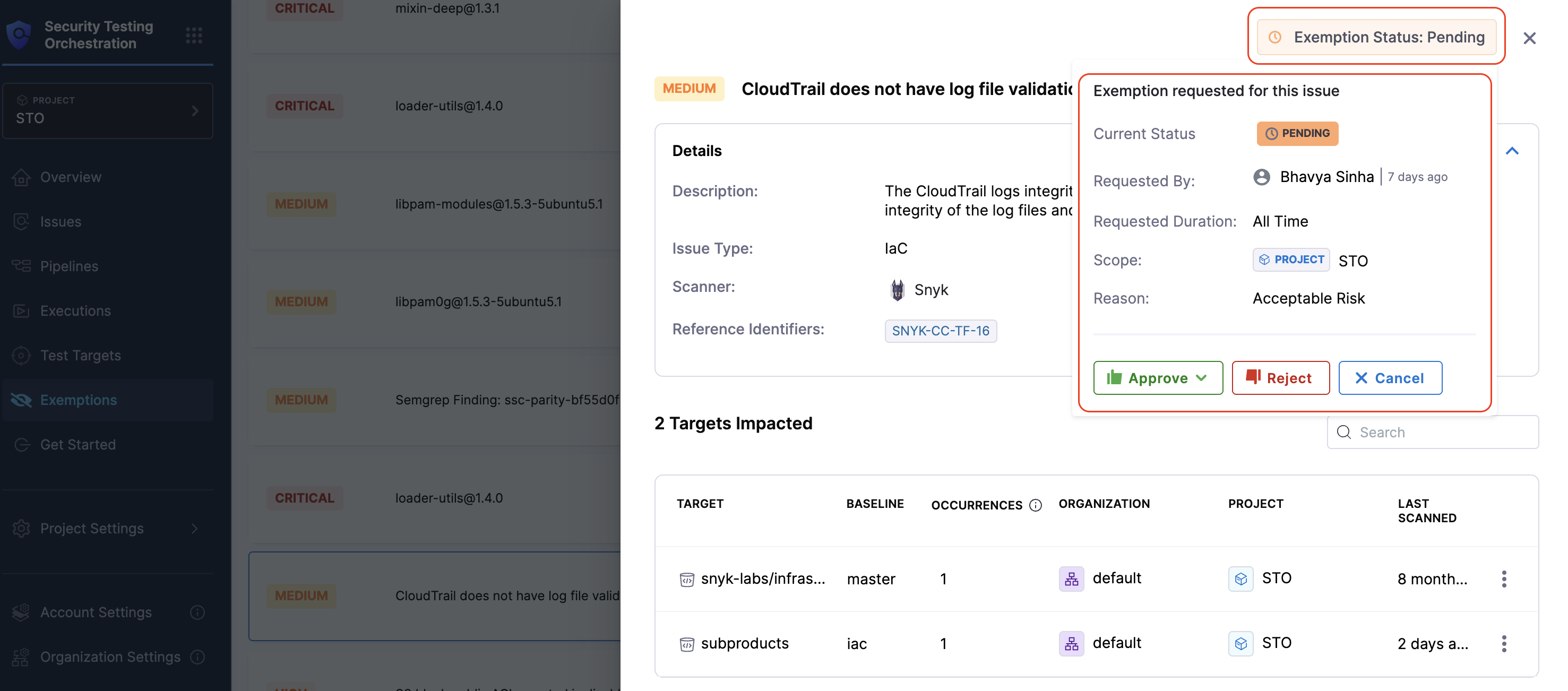 • Pending: Displays severity, issue, scope, reason, exemption duration, requested by, and action buttons such as Approve, Reject, or Cancel.