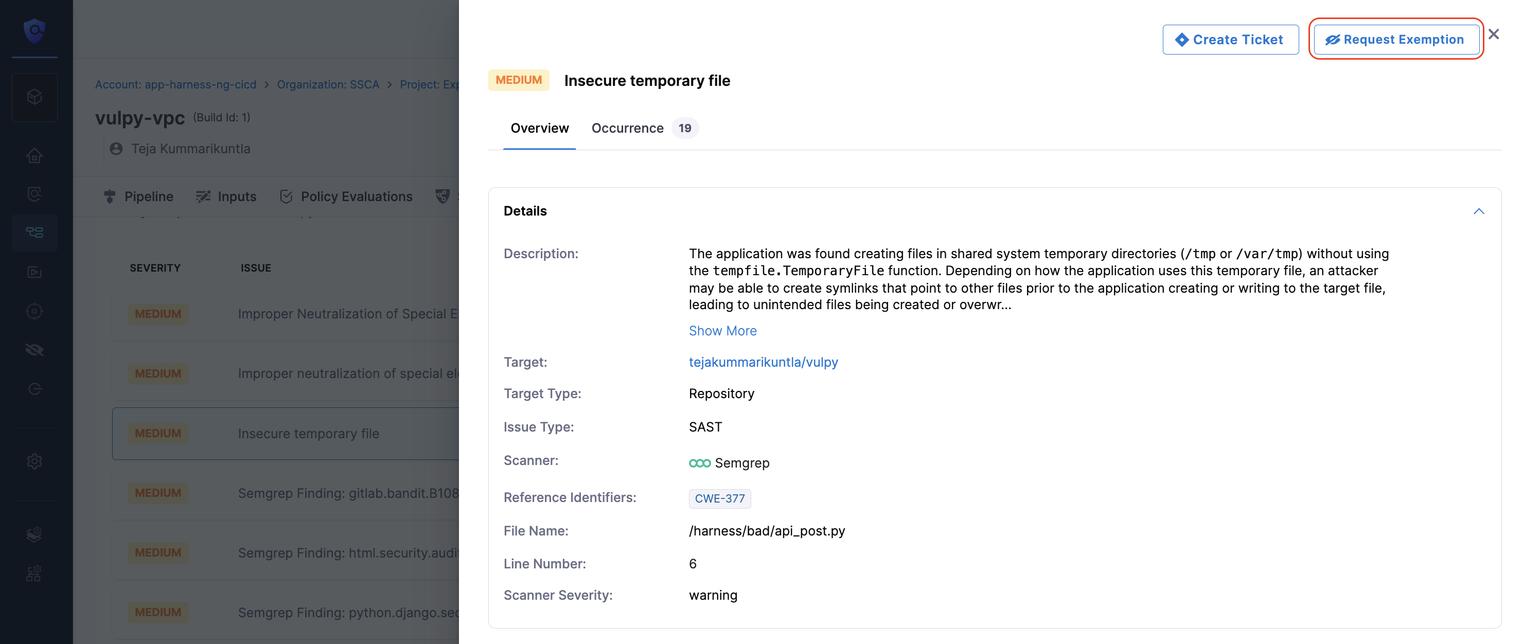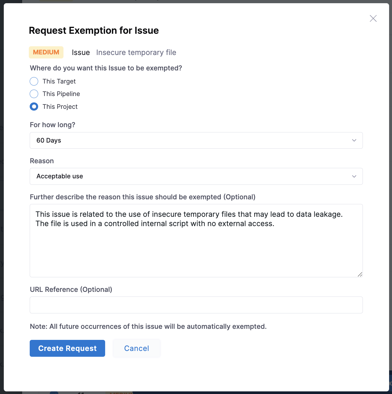 • This Pipeline: Exempts the issue only in the current pipeline. The issue is still reported in other pipelines or projects.