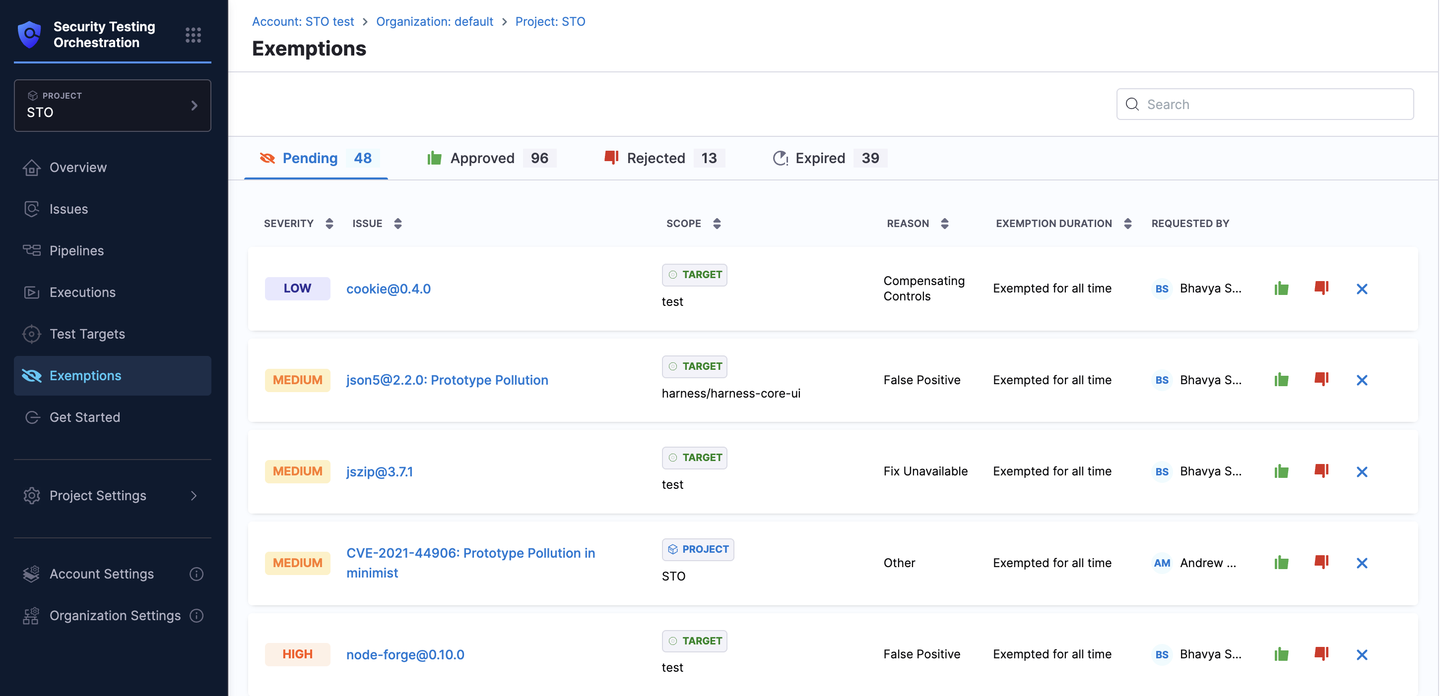 Reviewers have the flexibility to approve exemption requests either at the requested scope or extend the scope to the Organization or Account level during the review process. For more details, refer to Manage Issue Exemptions. To view submitted requests, refer to View Issue Exemptions.