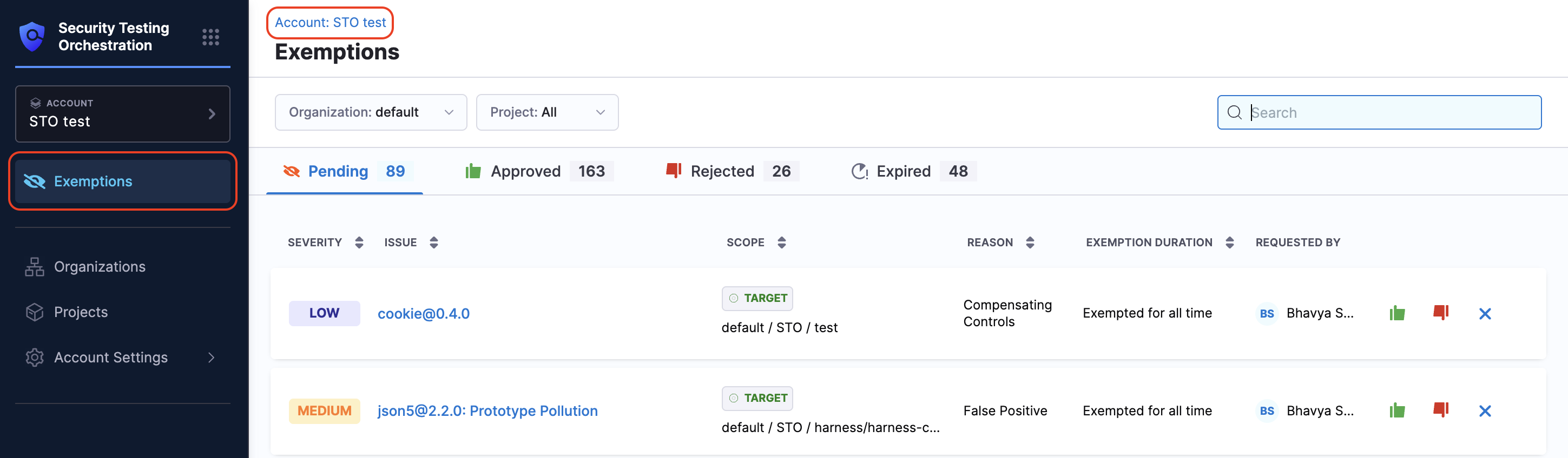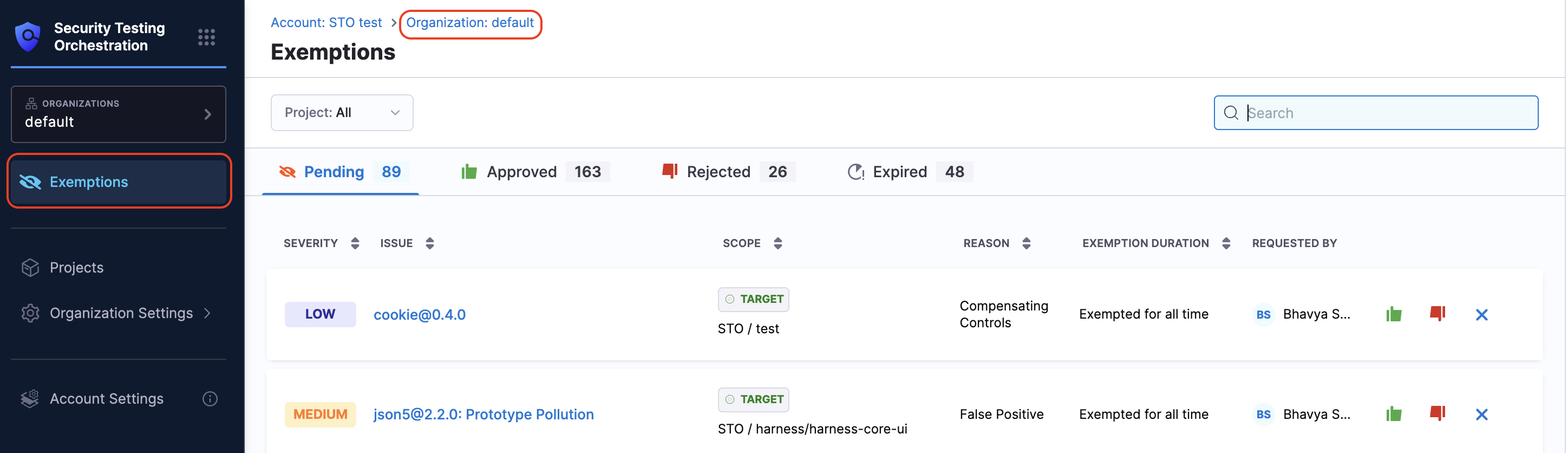 You can view all exemption requests from the Exemptions section in the left navigation. This section is accessible from your Project, Organization, and Account views. Each scope displays exemption requests relevant to that level: