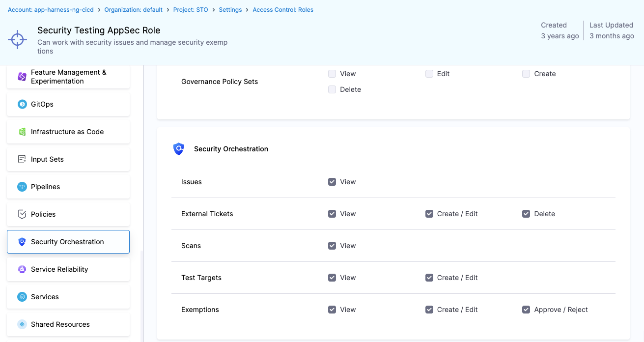 Harness includes two built-in roles specifically designed for STO use cases. Security Testing Developer and Security Testing AppSec. These roles come pre-configured with sets of permissions on STO resources to match typical developer and security team responsibilities.