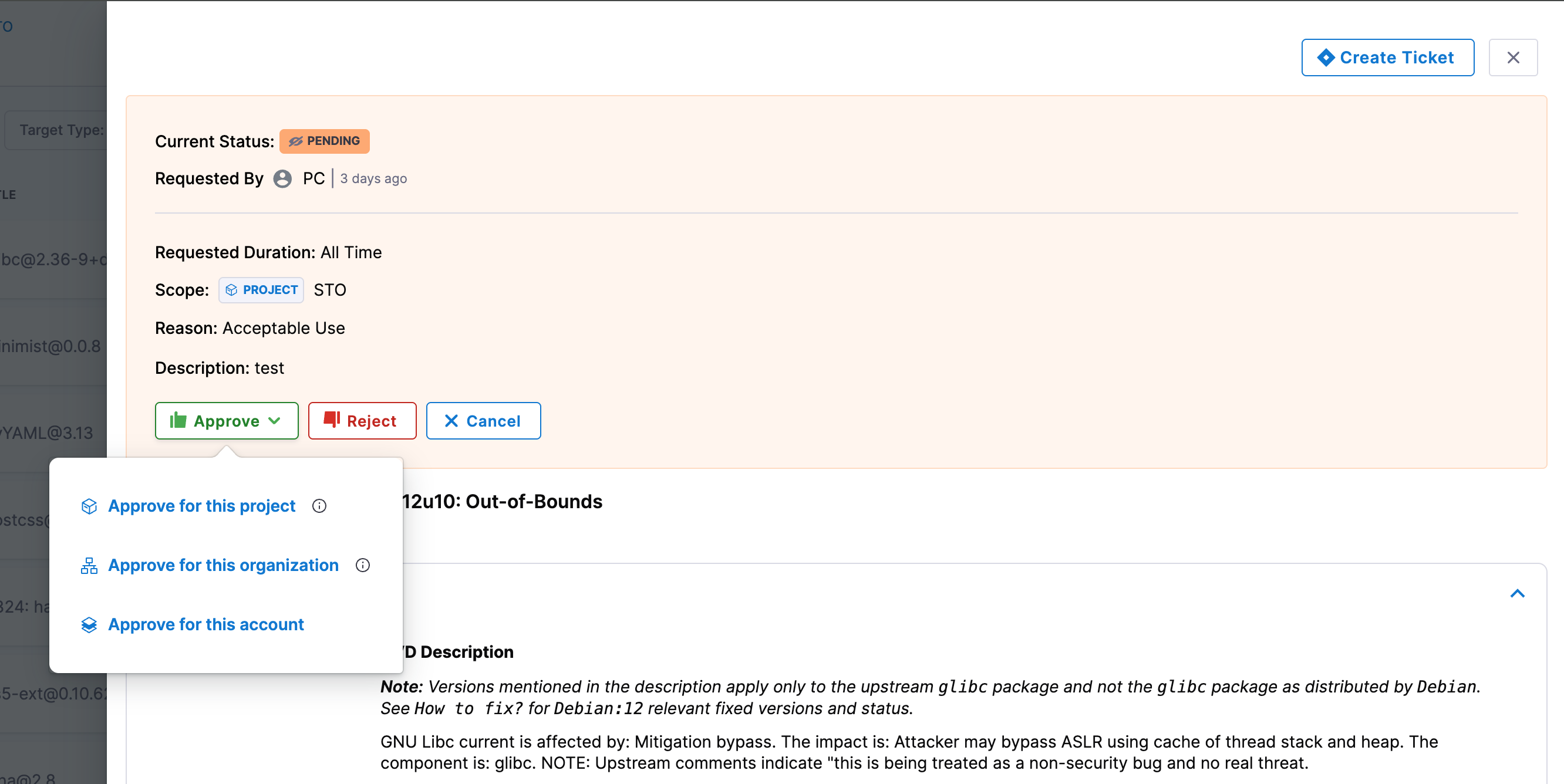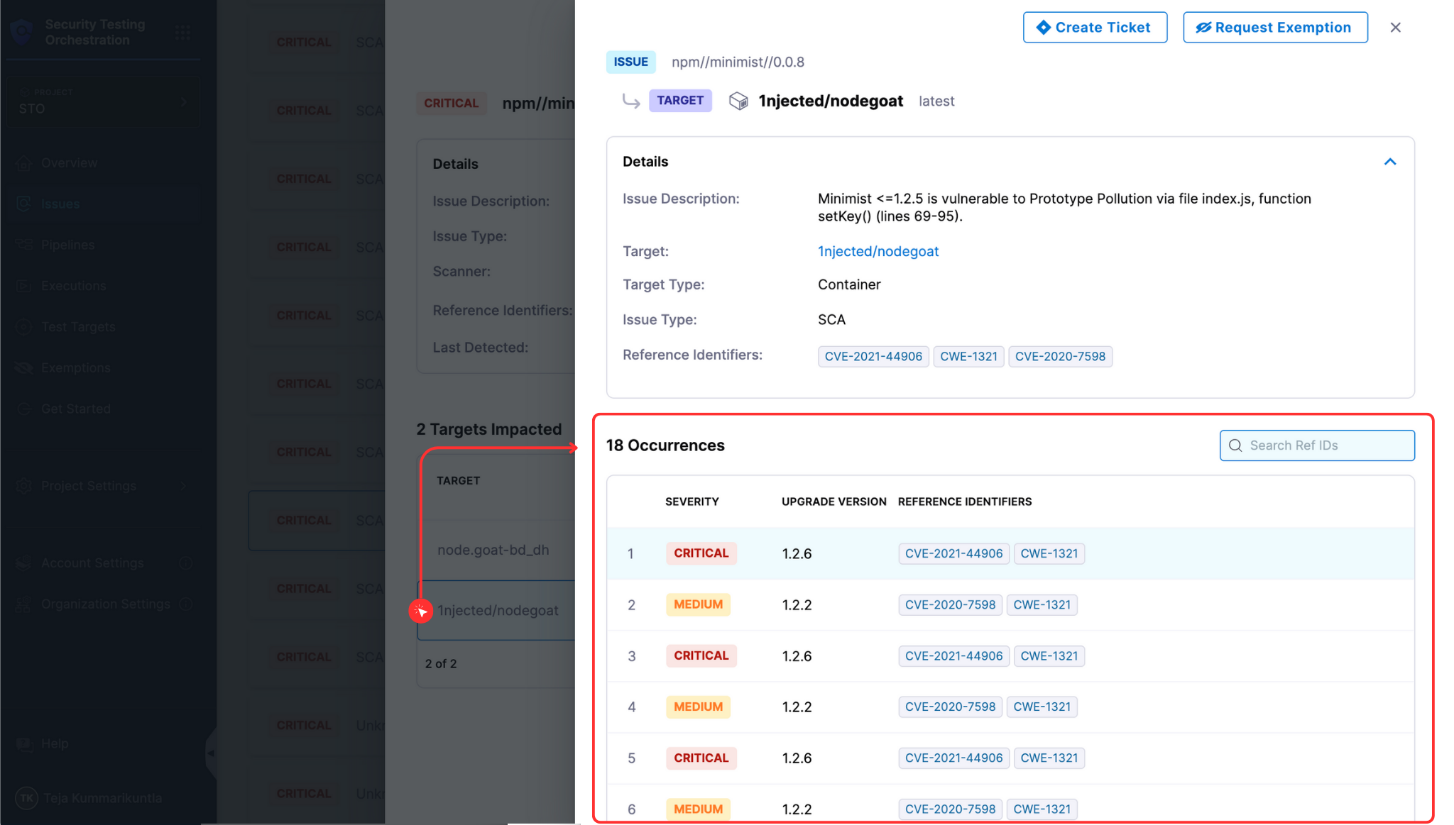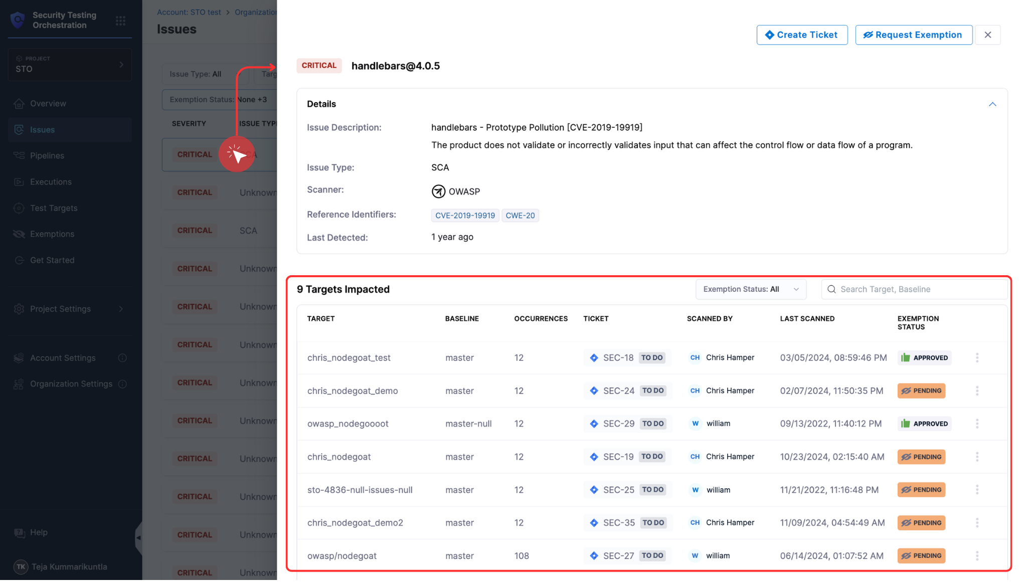 - Create a Jira ticket: Create project-scoped and target-scoped Jira tickets directly from the Issues section.