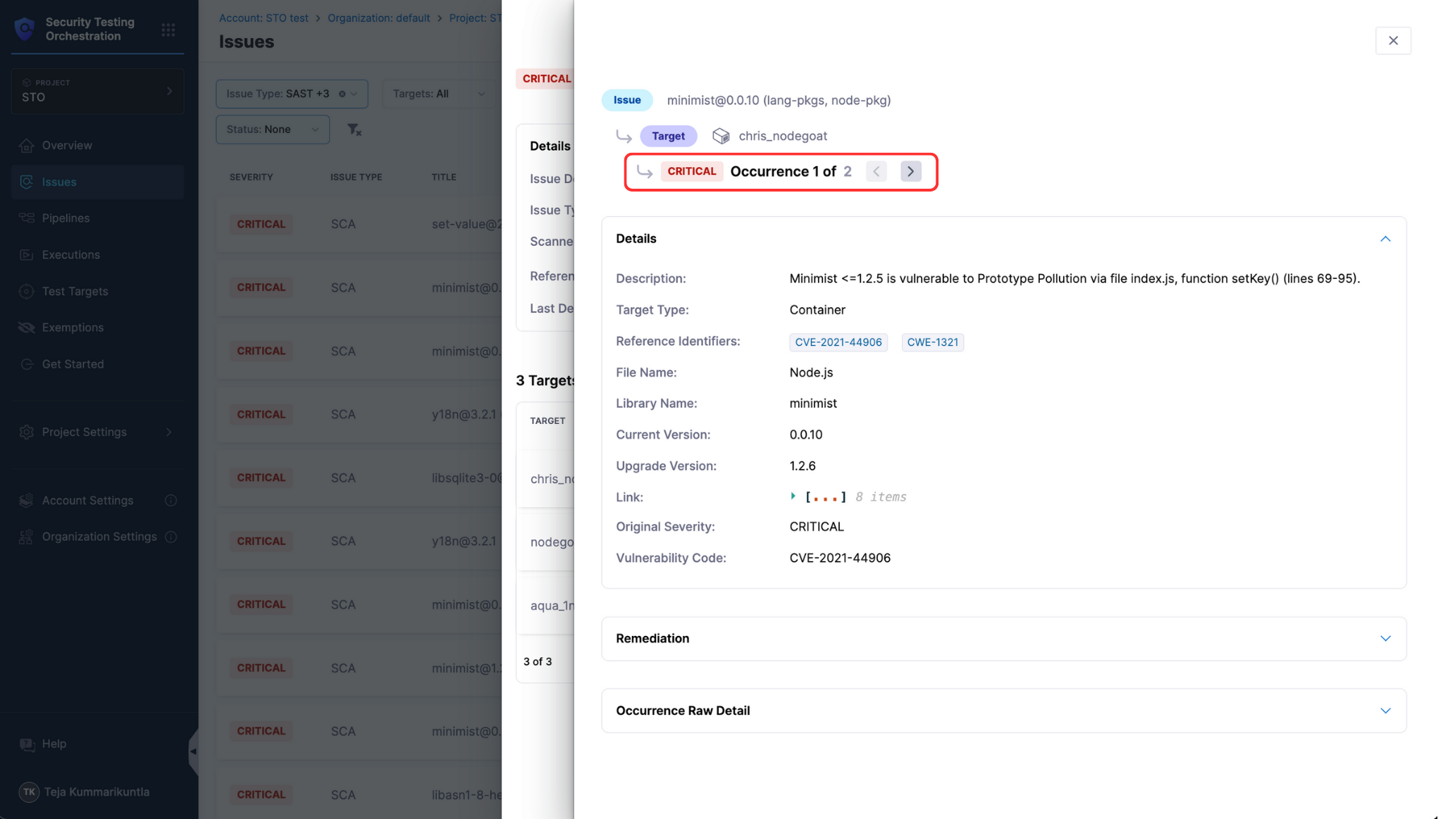 - View occurrences of the issue: View occurrences of the issue for the selected target.
