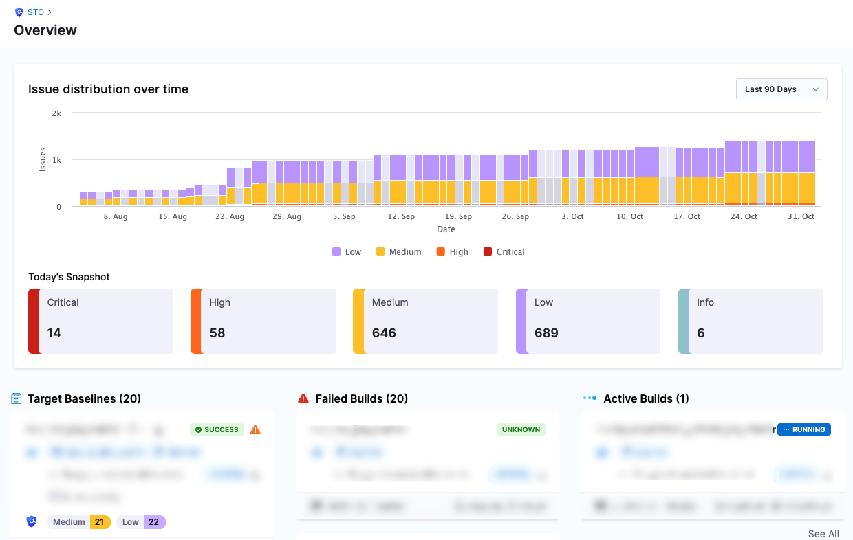 To see all target baselines in the project, go to the left menu and select Security Testing Orchestration > Overview. This dashboard enables you to see all detected issues in your main