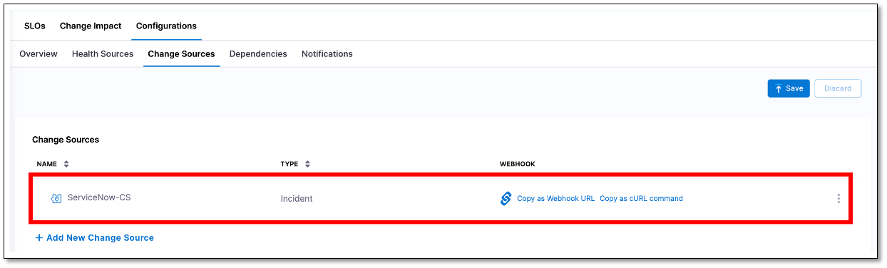 Locate the ServiceNow incident change source that you want to configure with ServiceNow, and then copy the webhook URL associated with the change source.